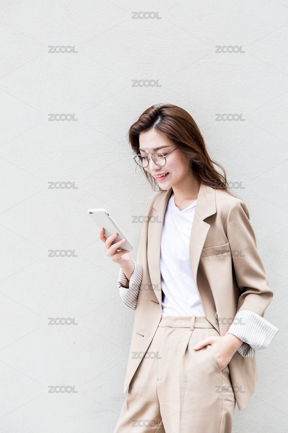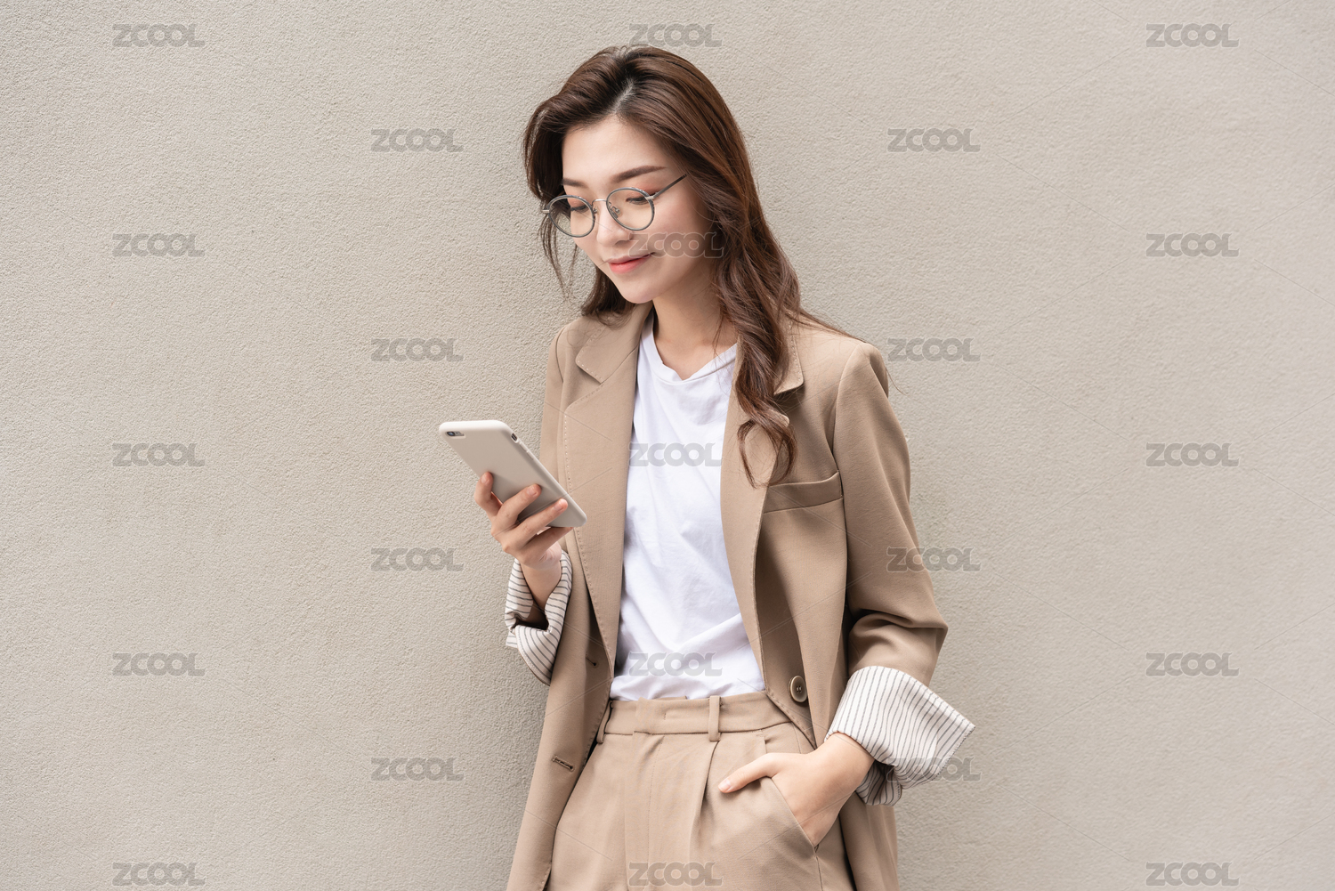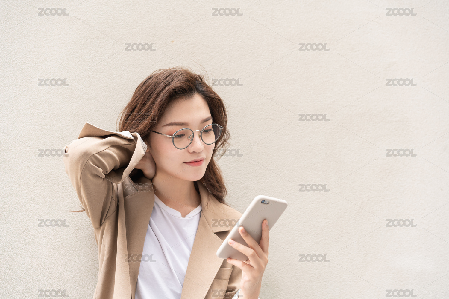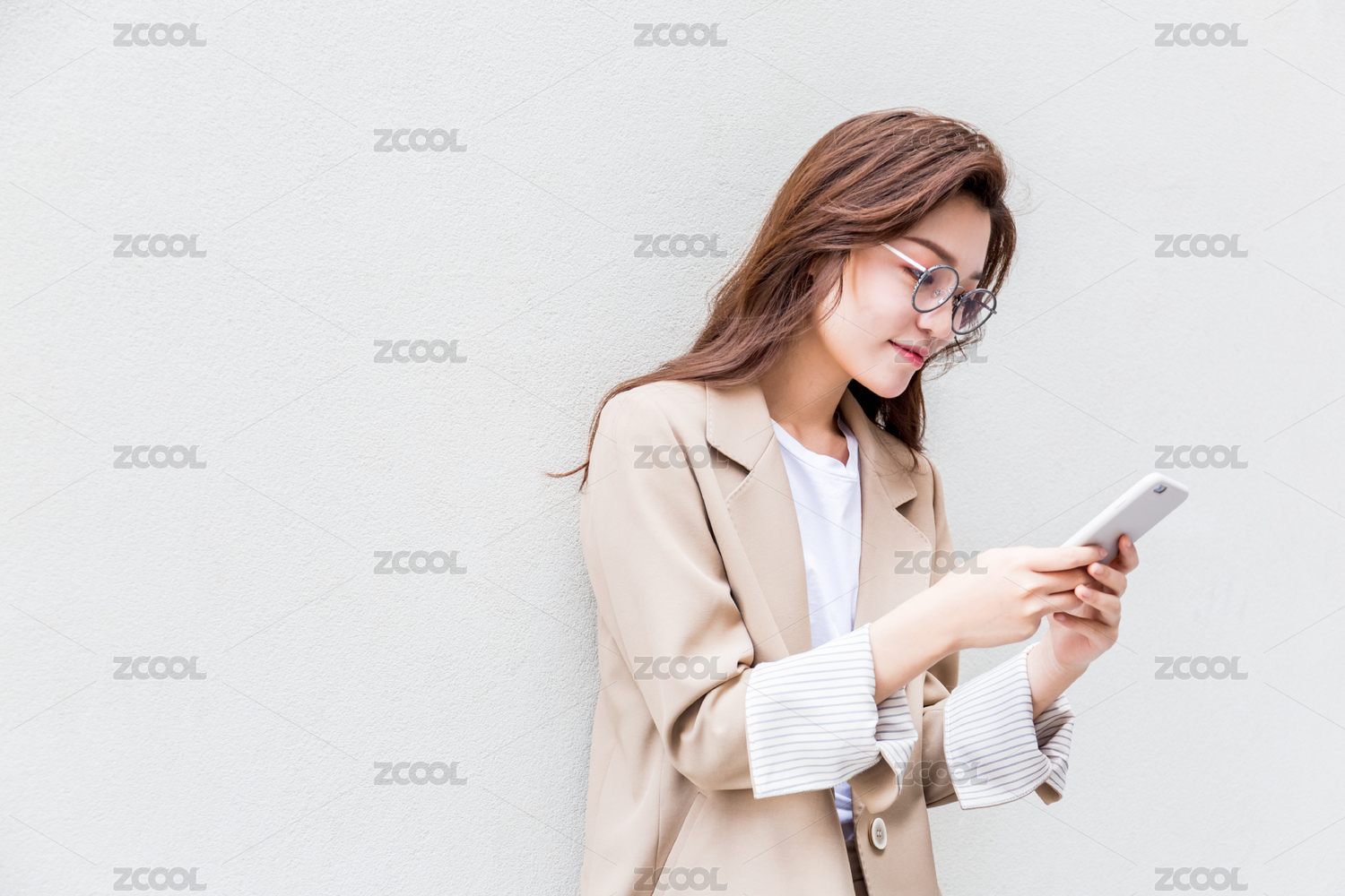 年轻亚洲商务人士在纯色背景墙前看手机