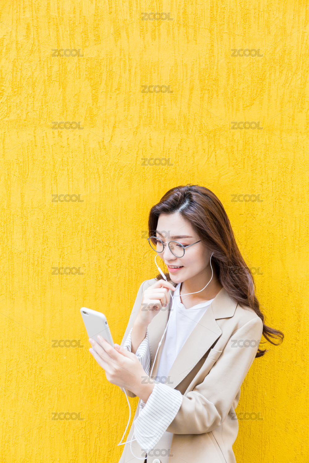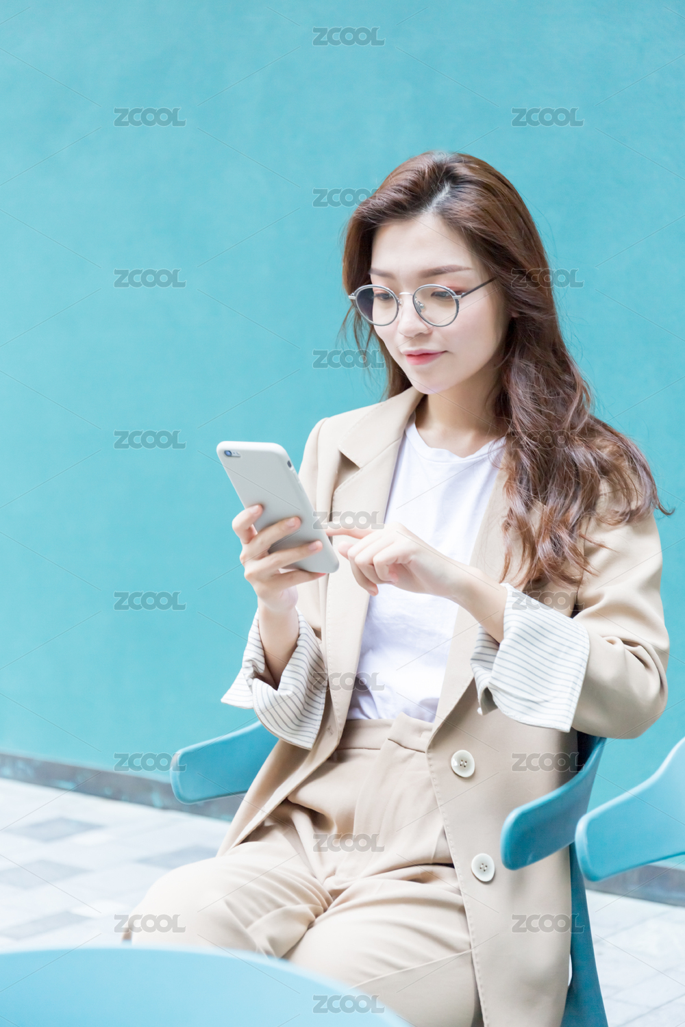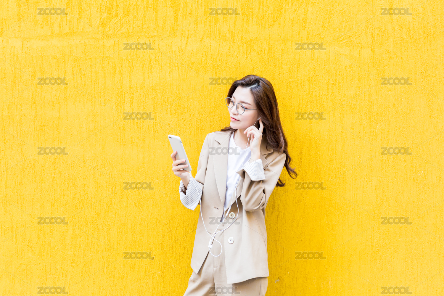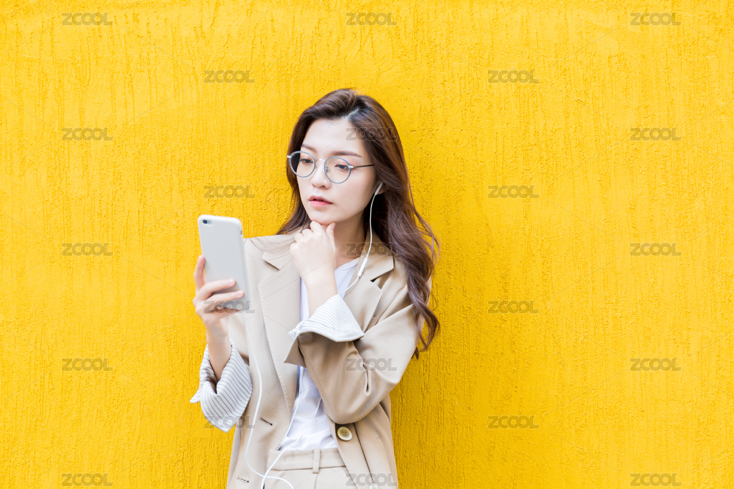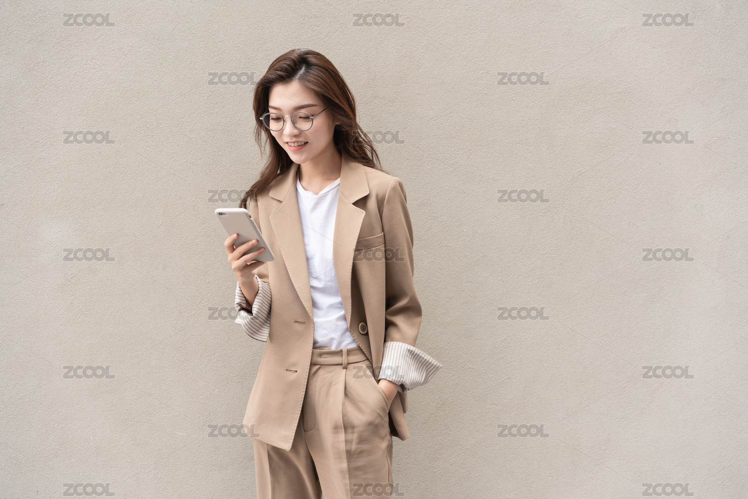 年轻亚洲商务人士在纯色背景墙前看手机