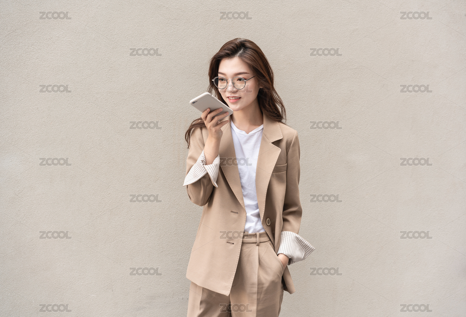 年轻亚洲商务人士在纯色背景墙前用手机发语音