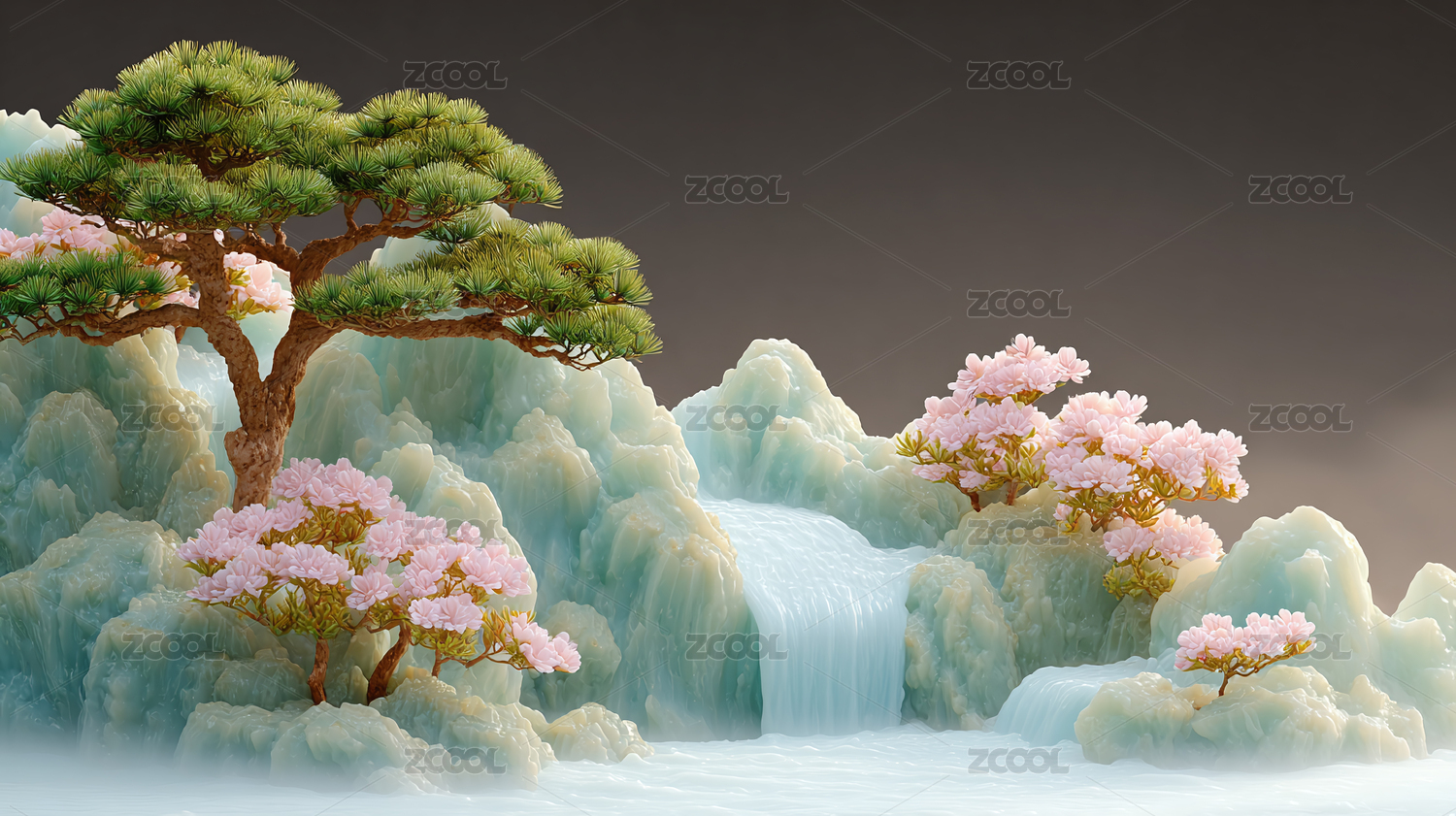 玉雕,盆景,山水,假山,园林,瀑布,微缩景观,翠玉,松树,树