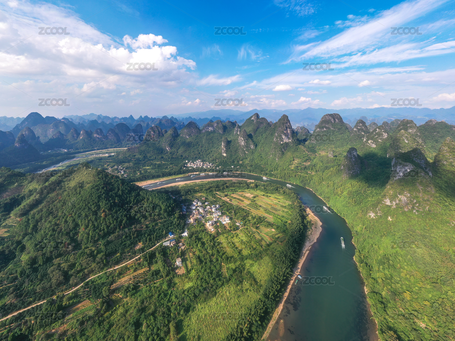 蓝天白云下的广西桂林山水漓江风光