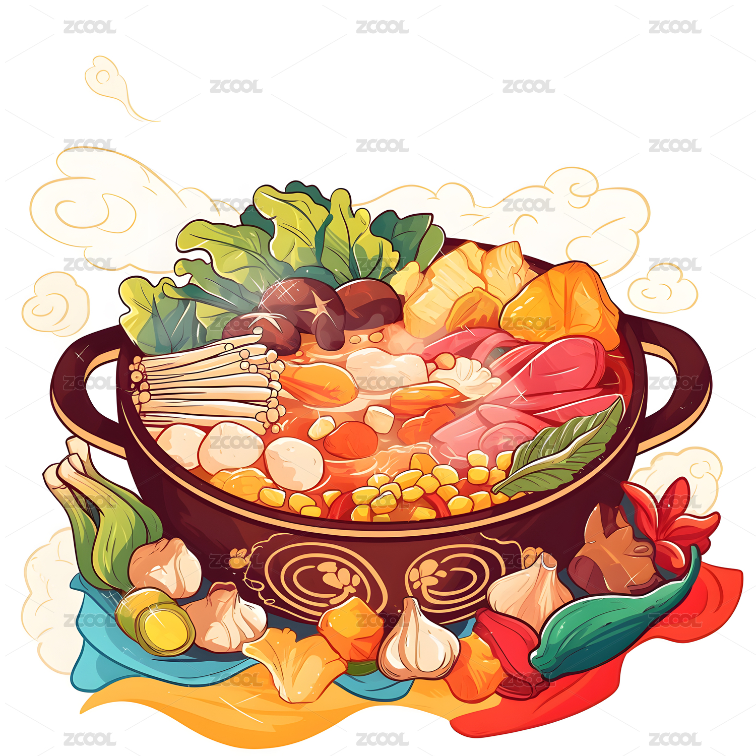 喷溅的汤汁和火锅及火锅食材美食国潮风插画