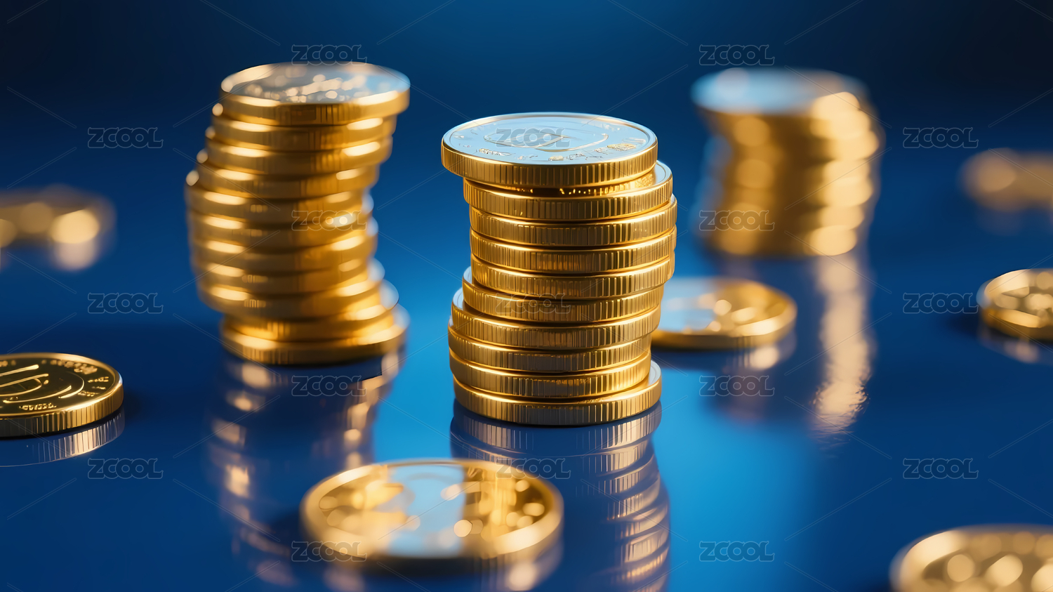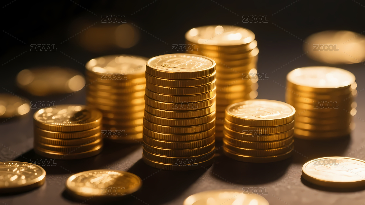 一堆金色的硬币和胶卷背景是模糊的金色光斑