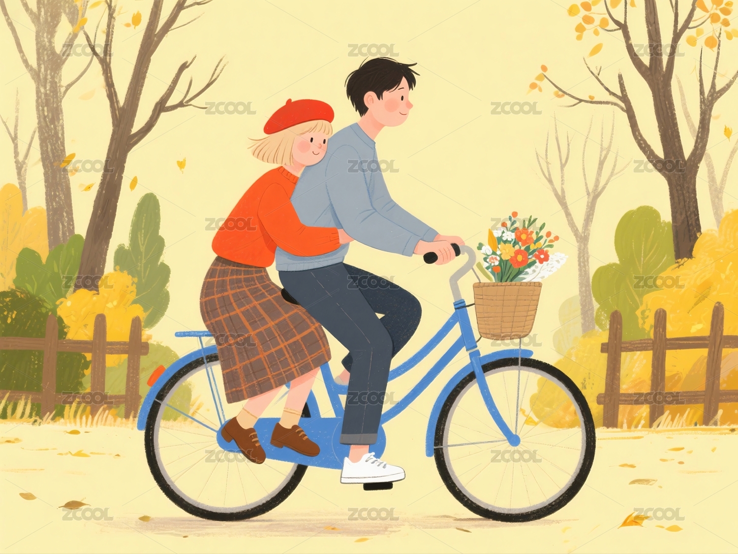 秋风瑟瑟中在路上骑自行车的一对情侣