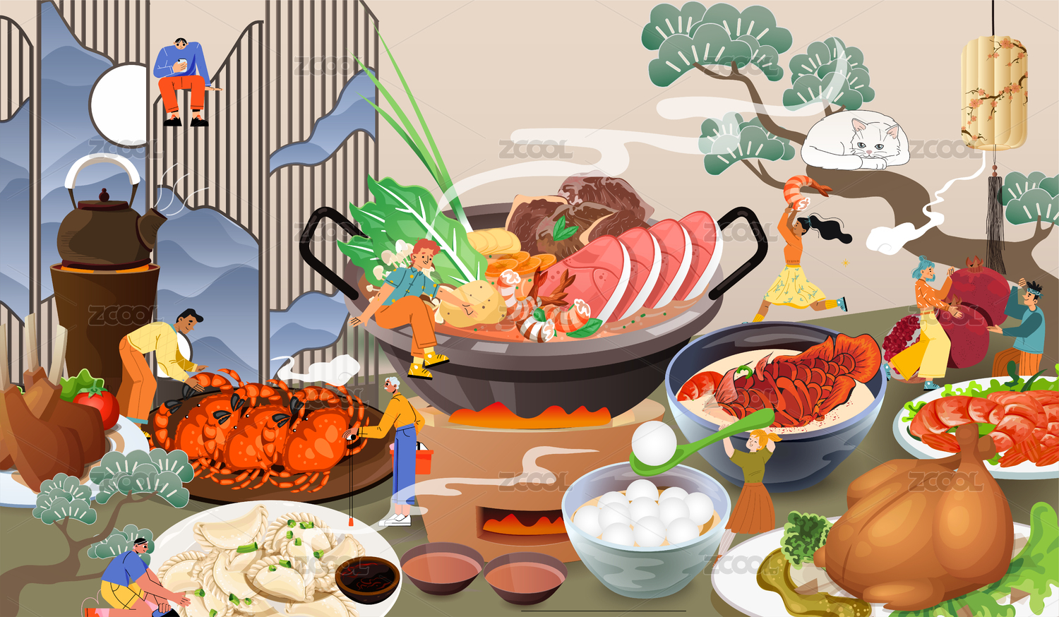 冬至年夜饭火锅屏风中国风氛围矢量插画海报