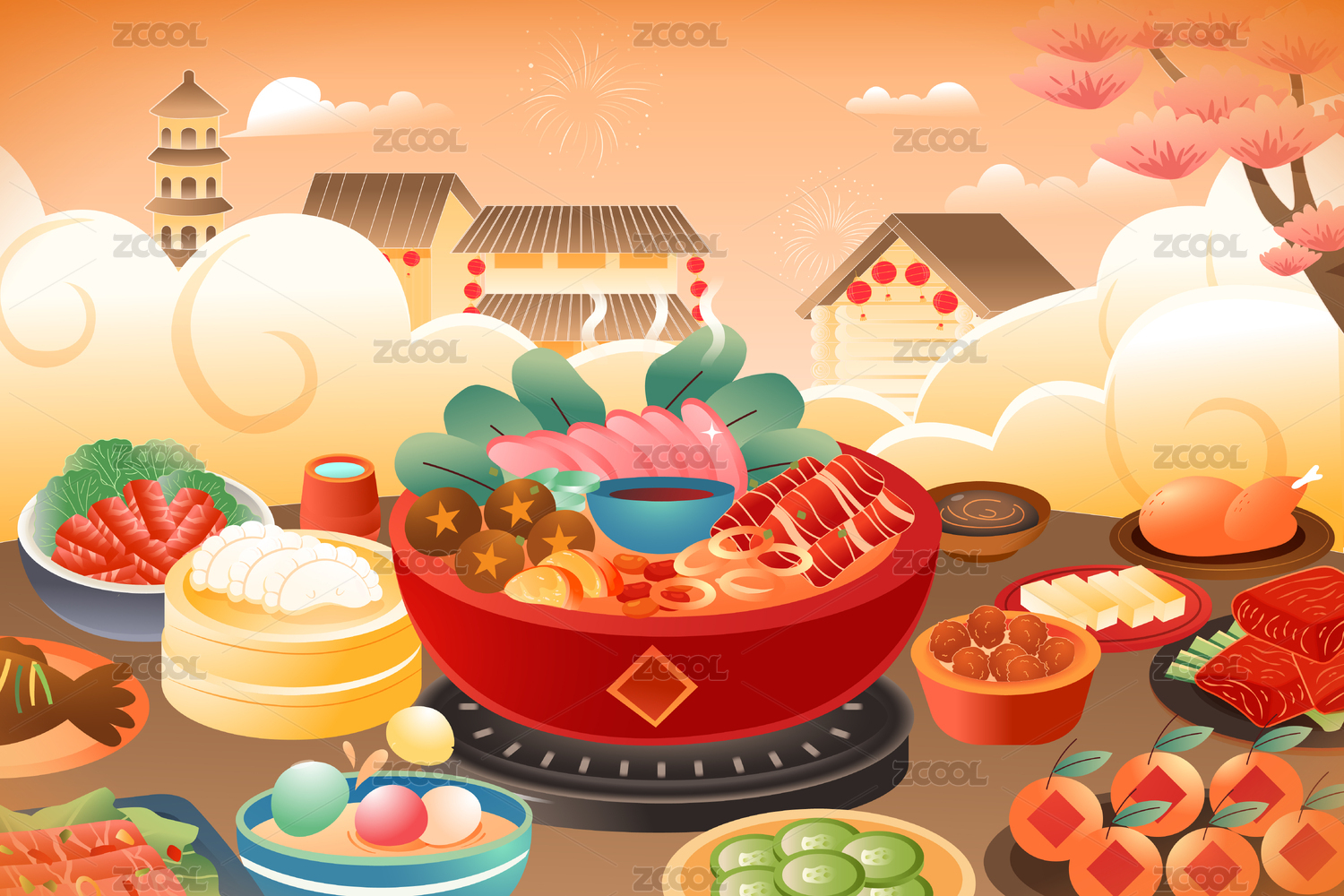 过节吃火锅美食年夜饭大餐中国风矢量插画