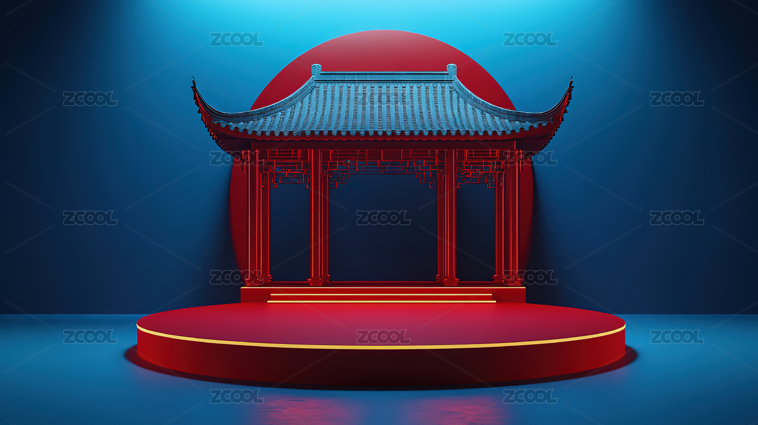 3d渲染的蓝色和红色中国风展台场景
