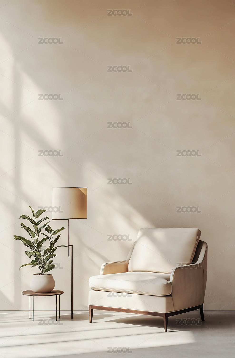空房间配有沙发和边桌浅橙色墙壁