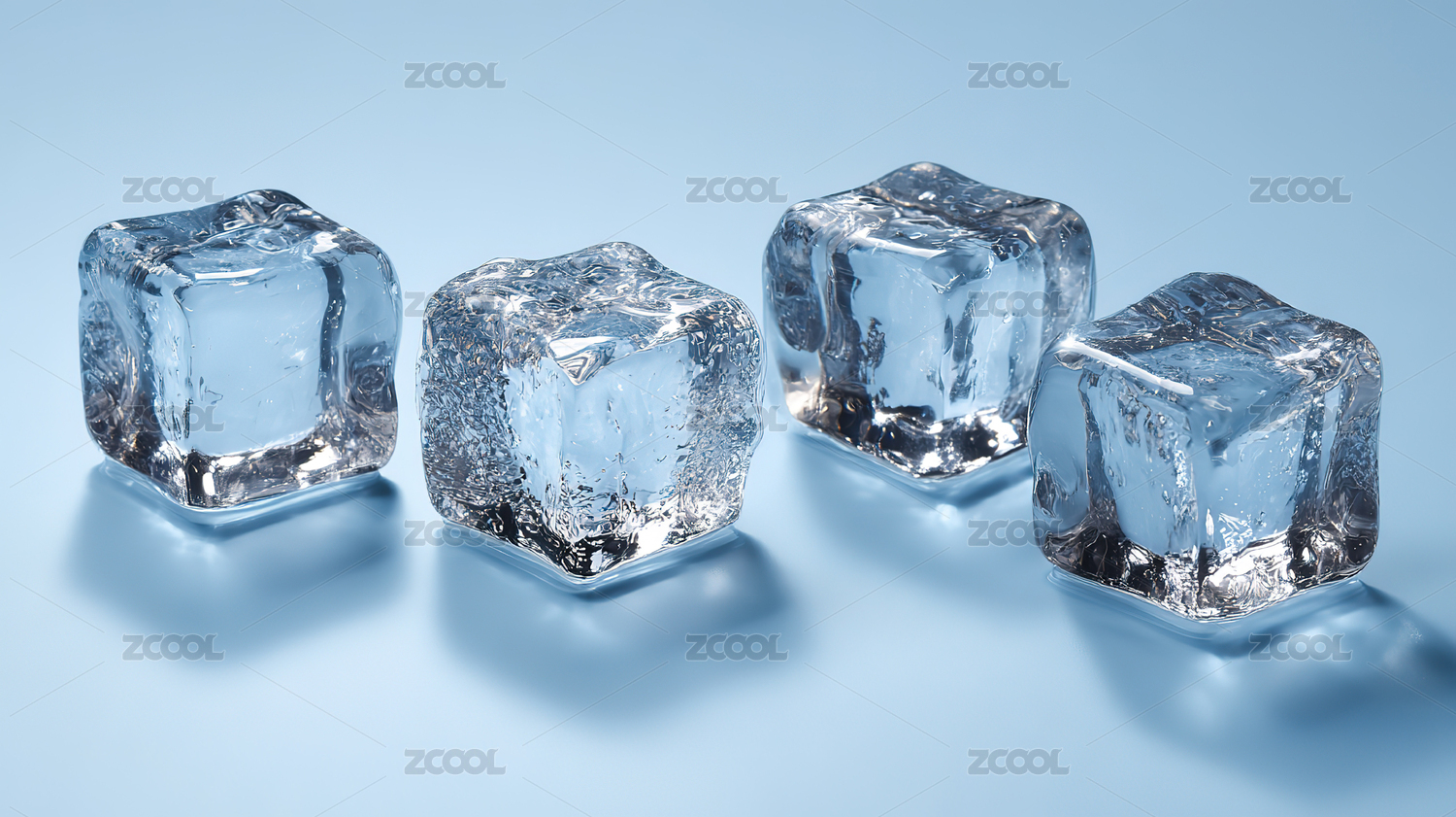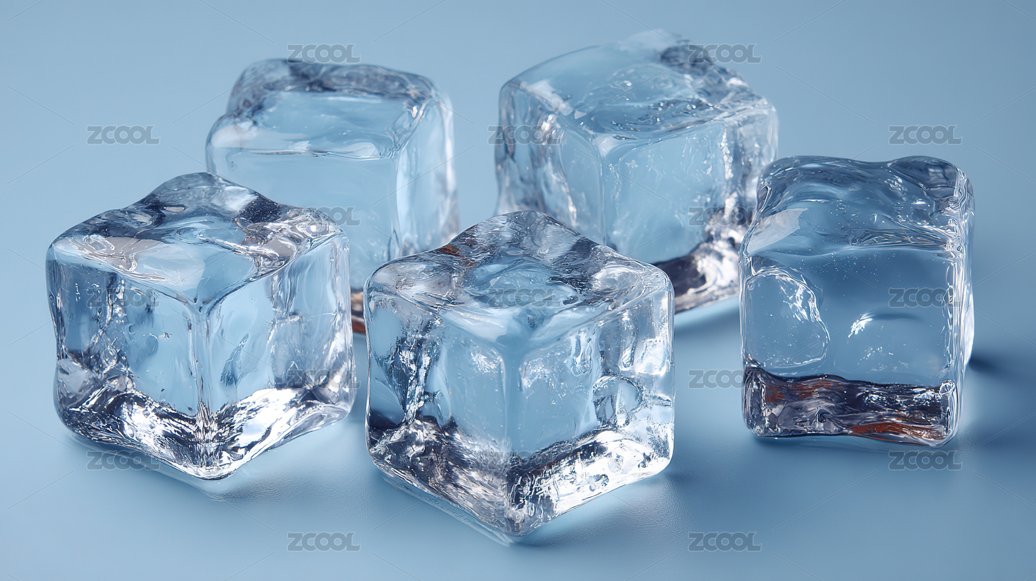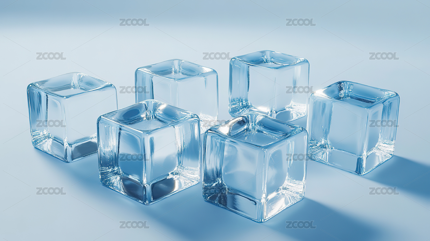 三块透明冰块置于蓝色背景上