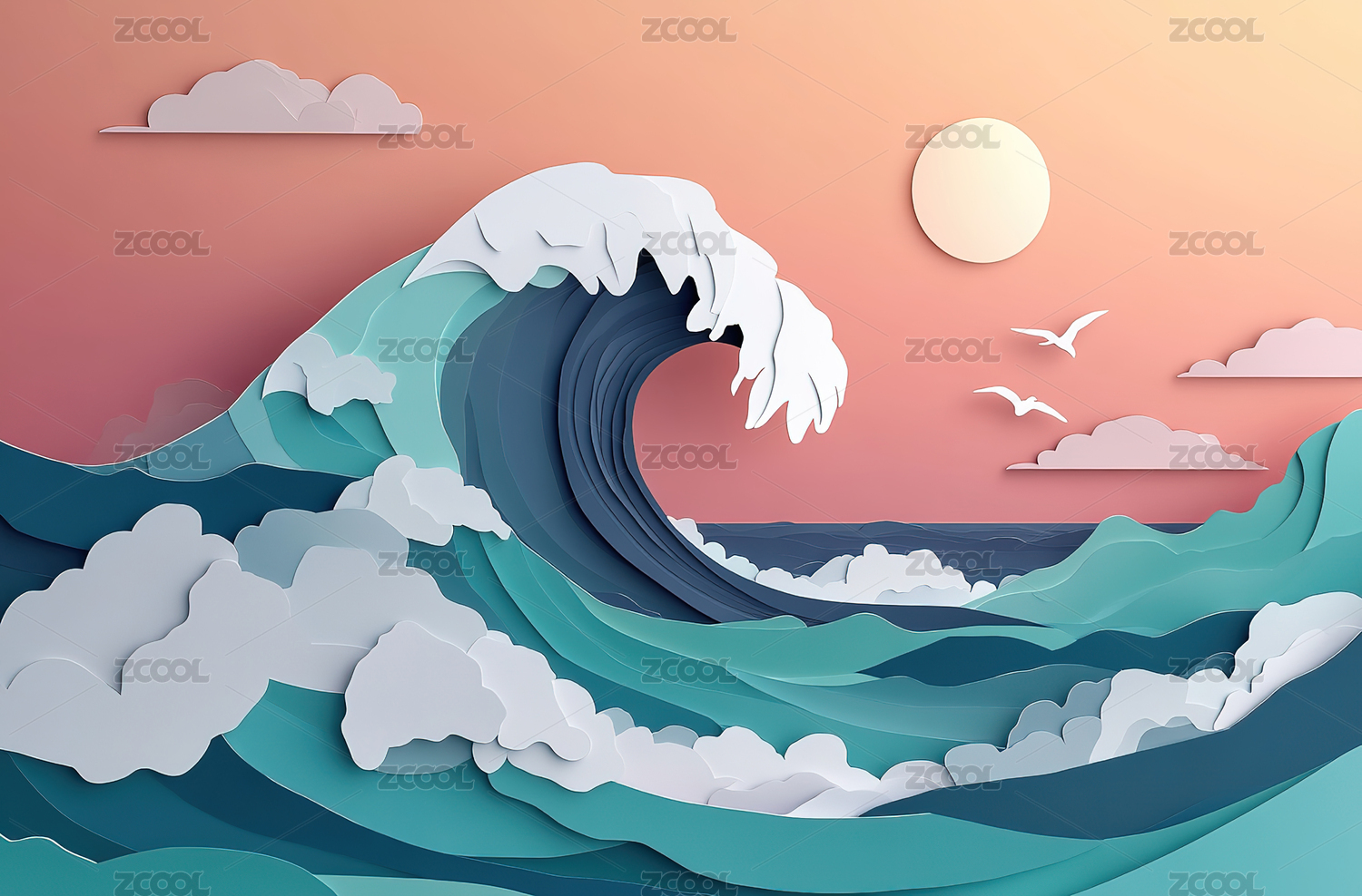海浪翻涌纸艺风格,旭日东升色彩鲜明