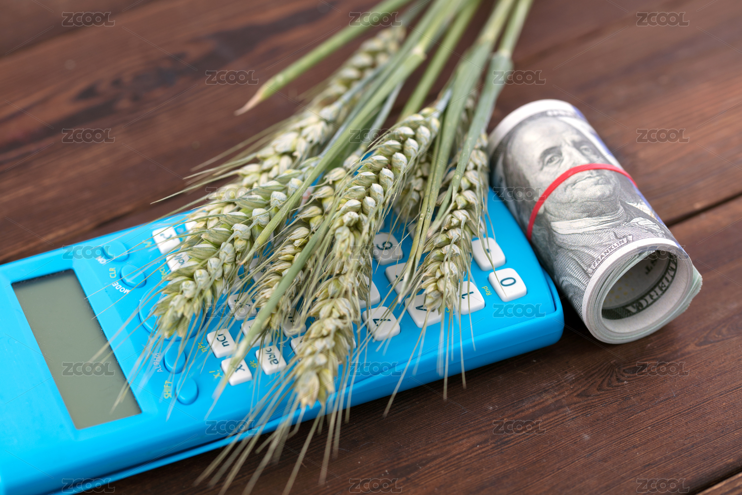 计算器压着三张美元钞票和旁边三根成熟的麦穗