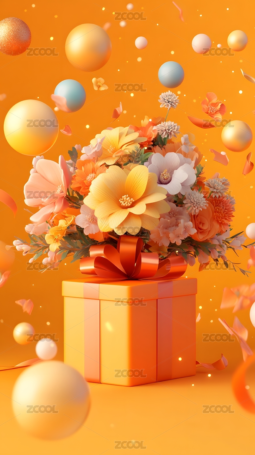 三维,立体,3D,渲染,礼物盒,包装,橙色,花朵,植物,背景