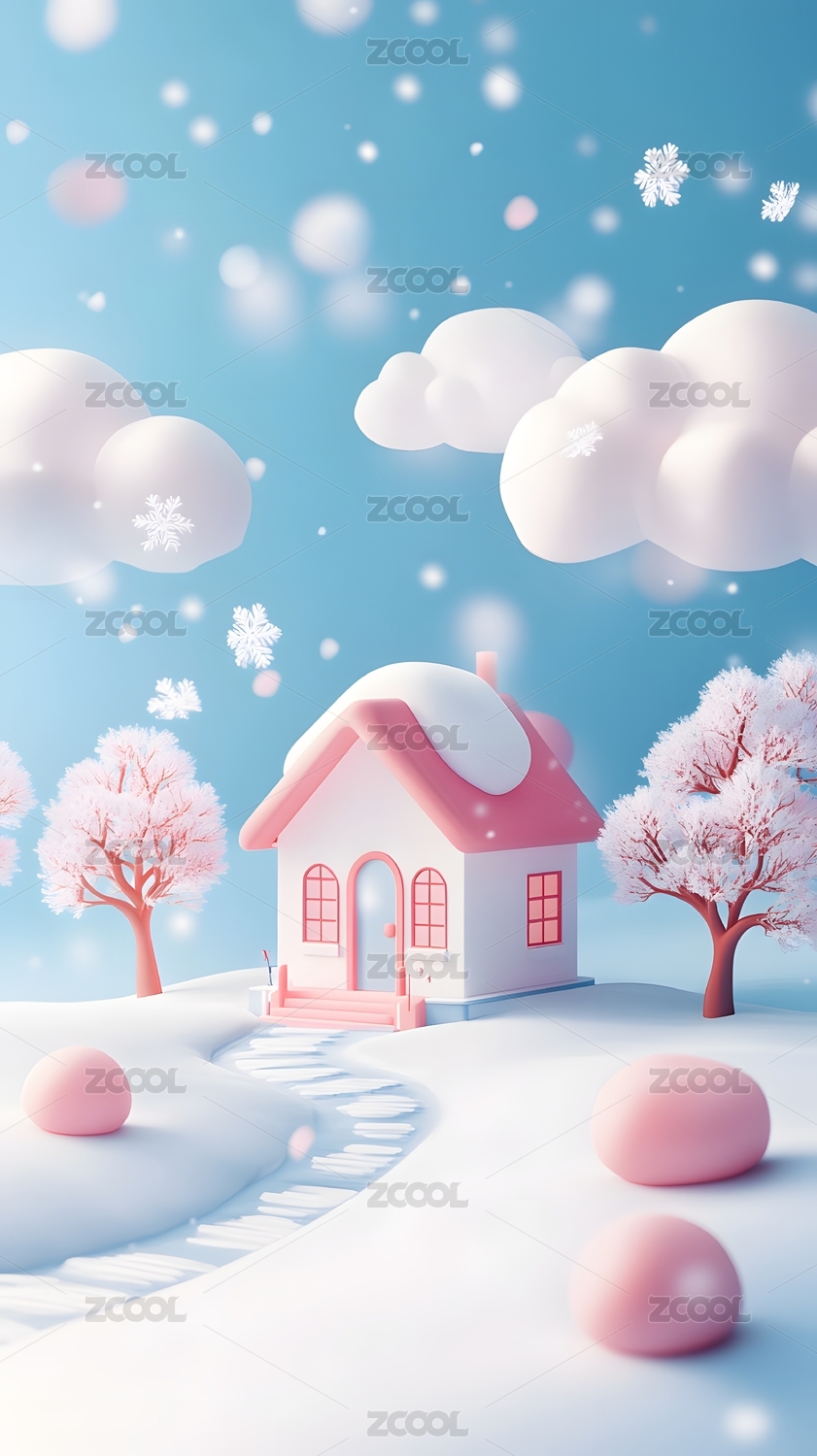 冬天白天有雪山坡上的木屋3D卡通立体插画