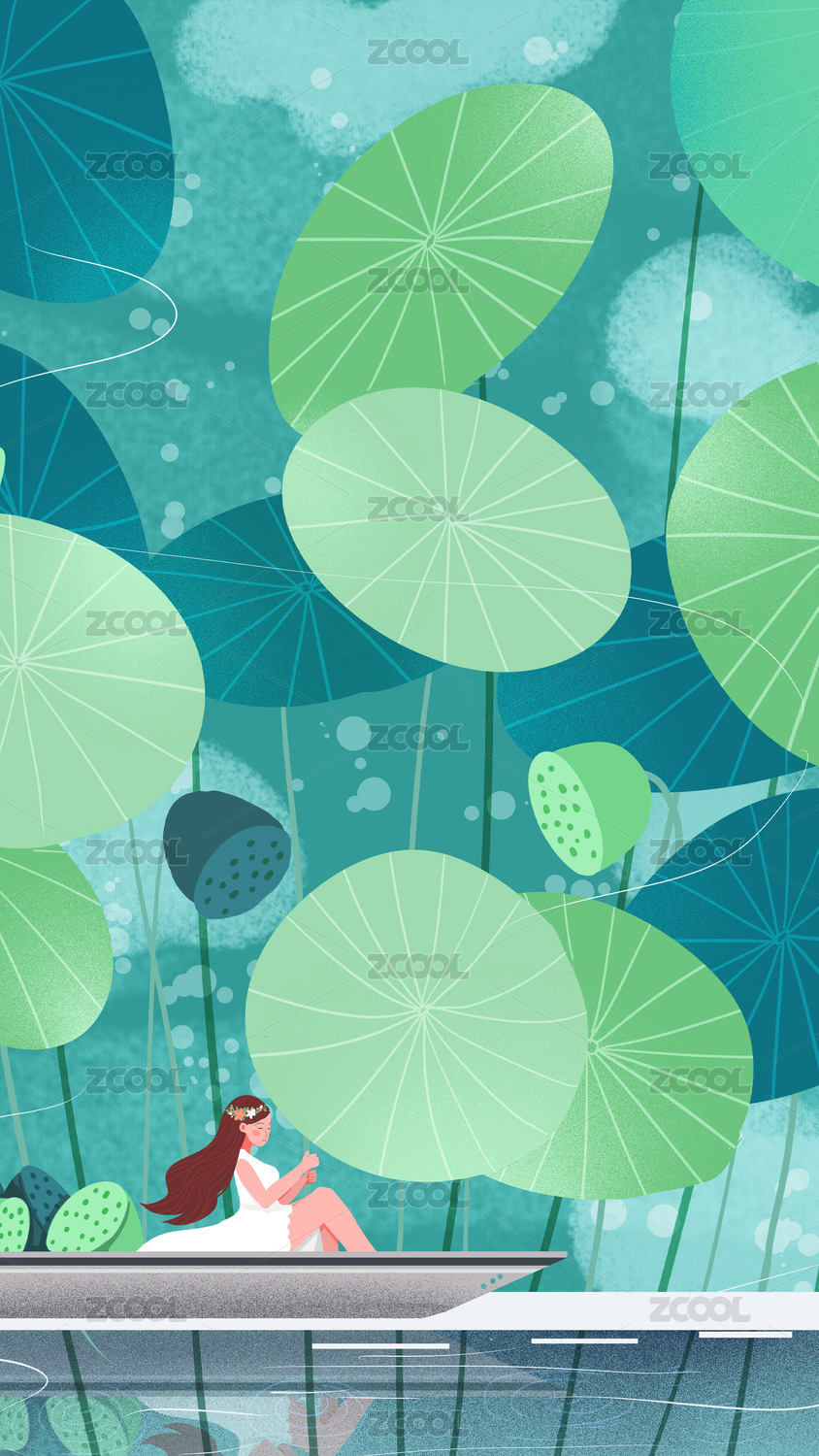 大暑二十四节气,绿色荷花池中船上的孩子创意插画