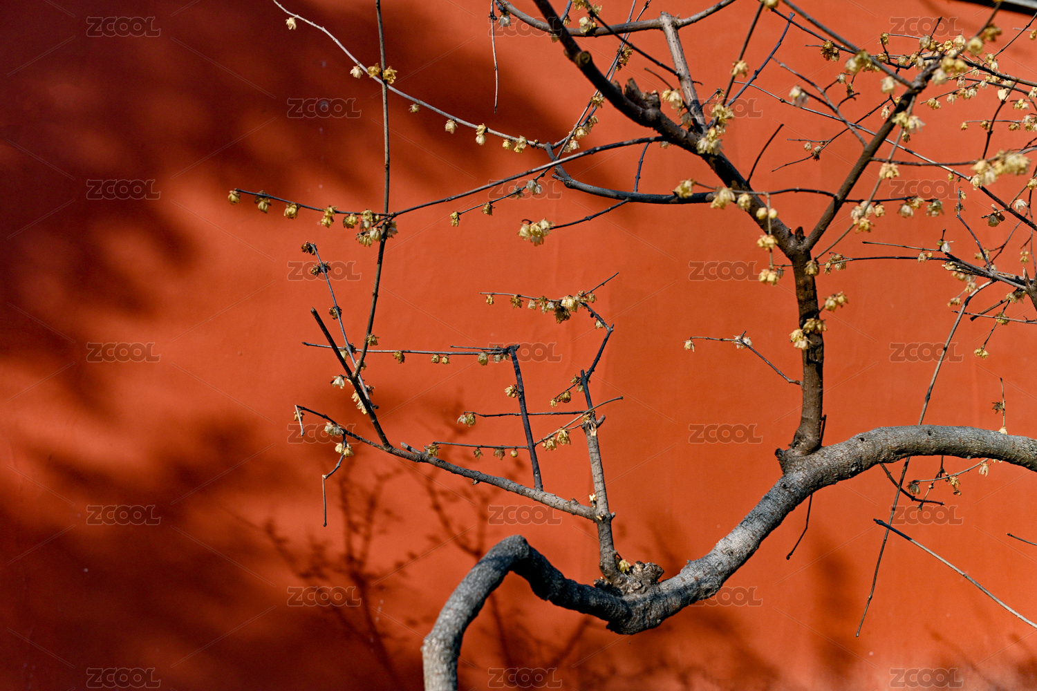 红色的墙与黄色的腊梅花