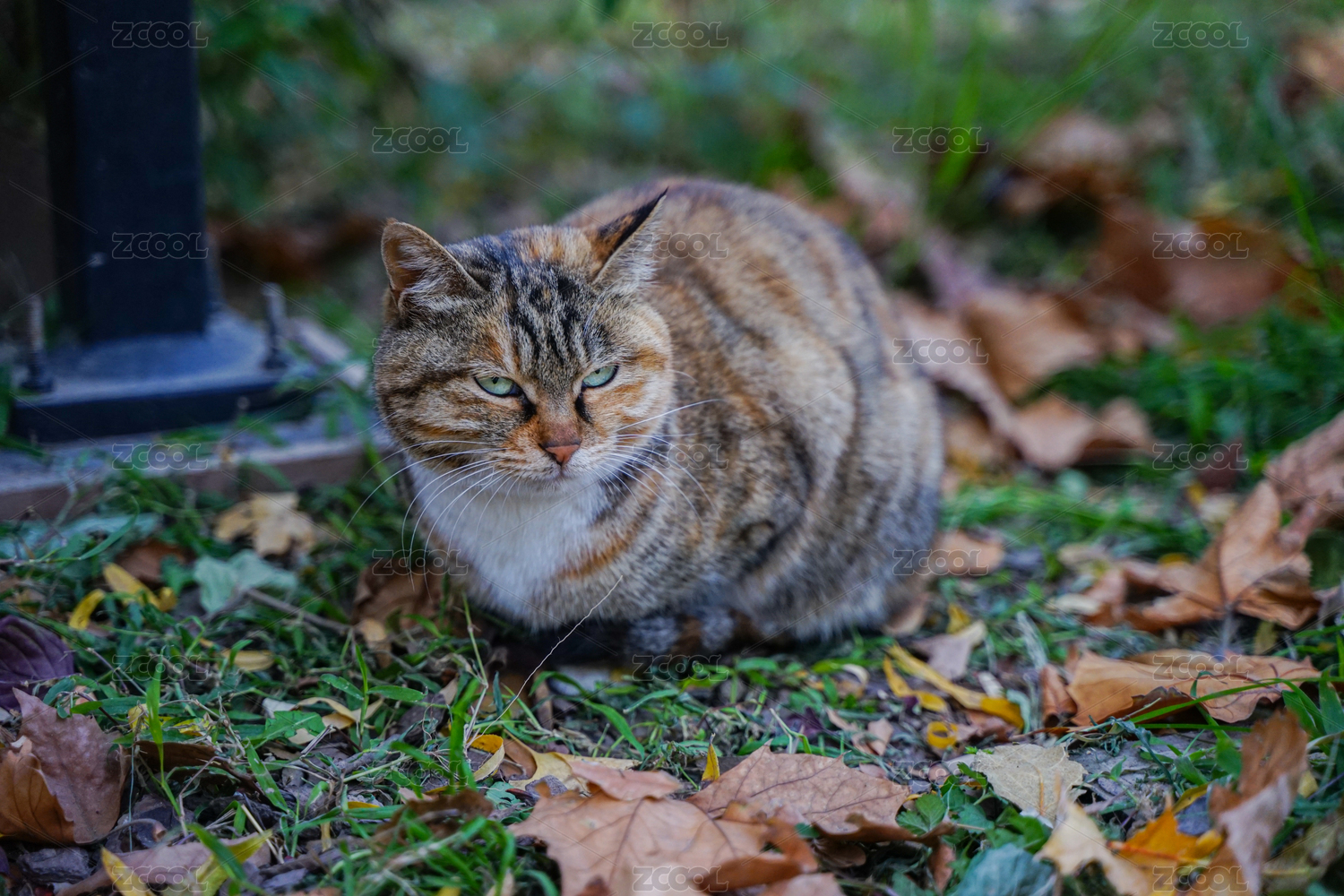 公园里的流浪猫,拥有灰色的条纹和橙色的眼睛
