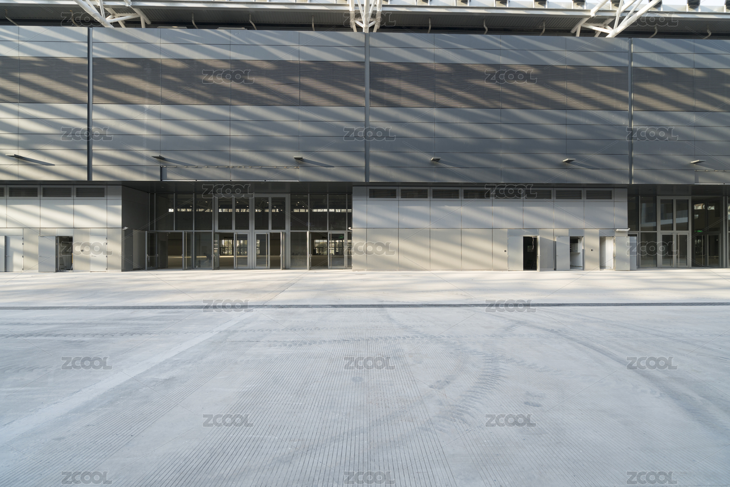 夕照下中国福建龙岩会展中心一现代化建筑外面开阔的空的大理石地面
