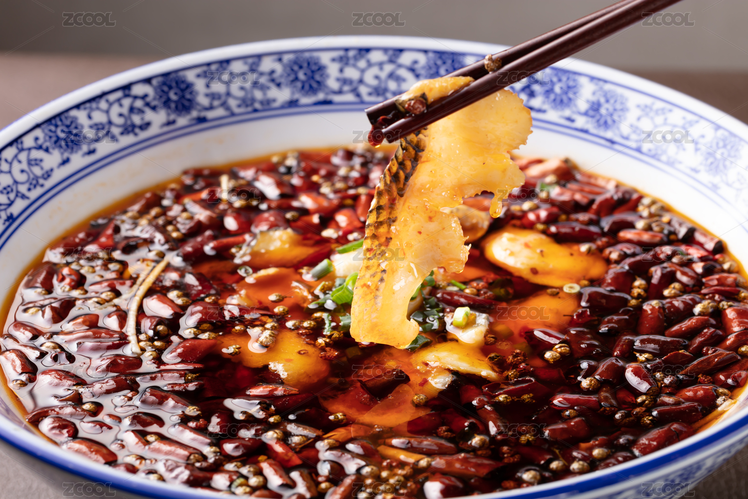 川菜青花瓷碗里筷子夹着的麻辣水煮鱼片