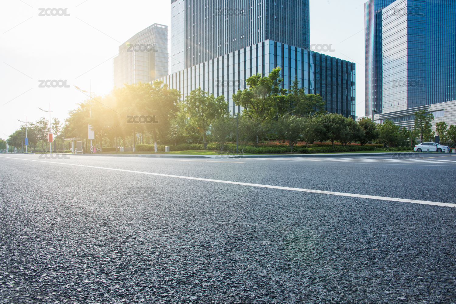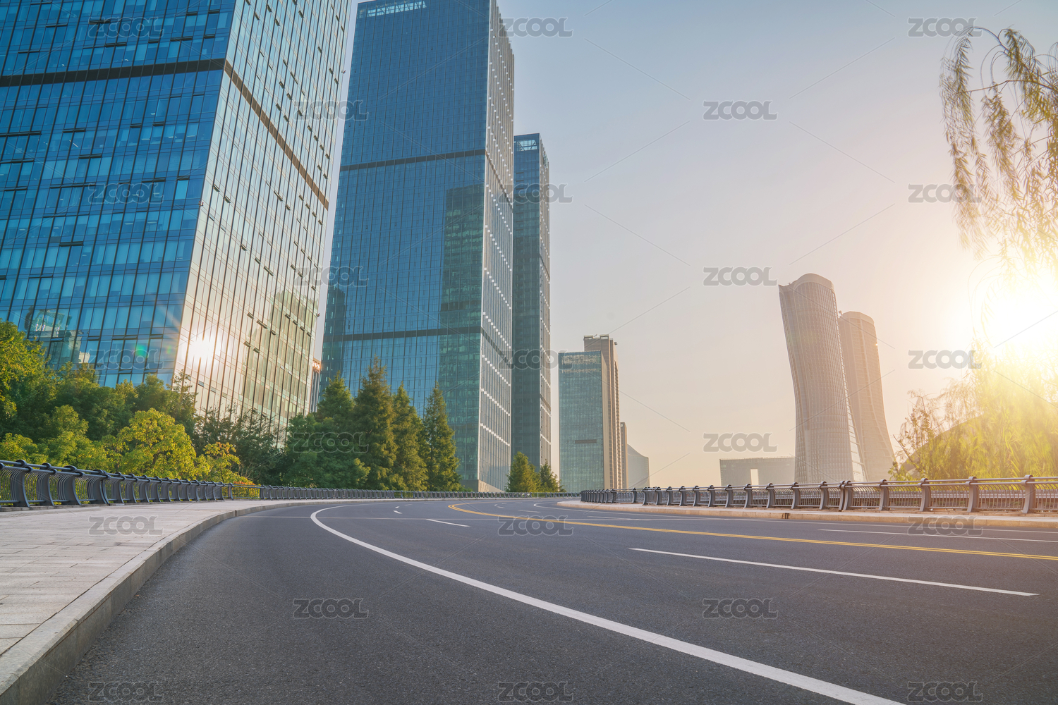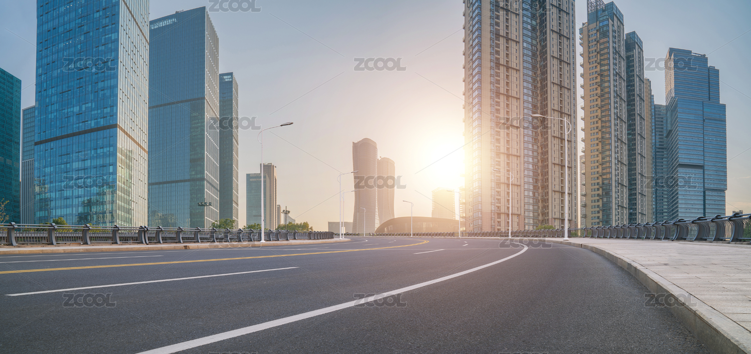 中国武汉空旷的柏油马路和现代城市建筑天际线