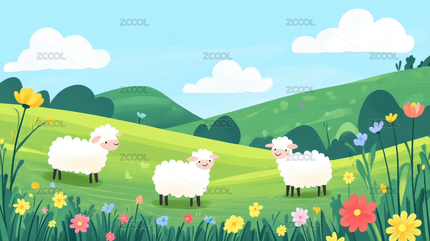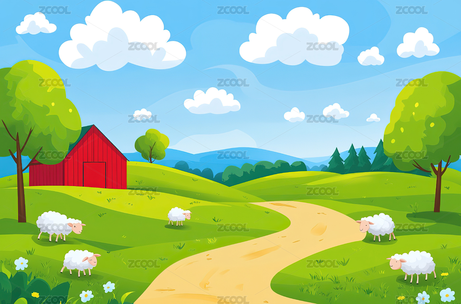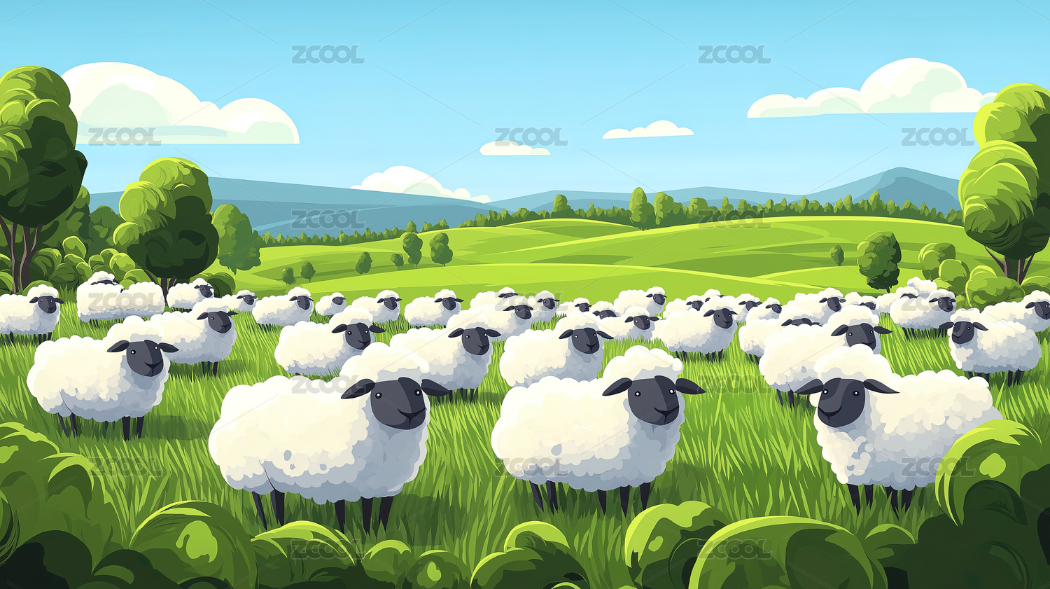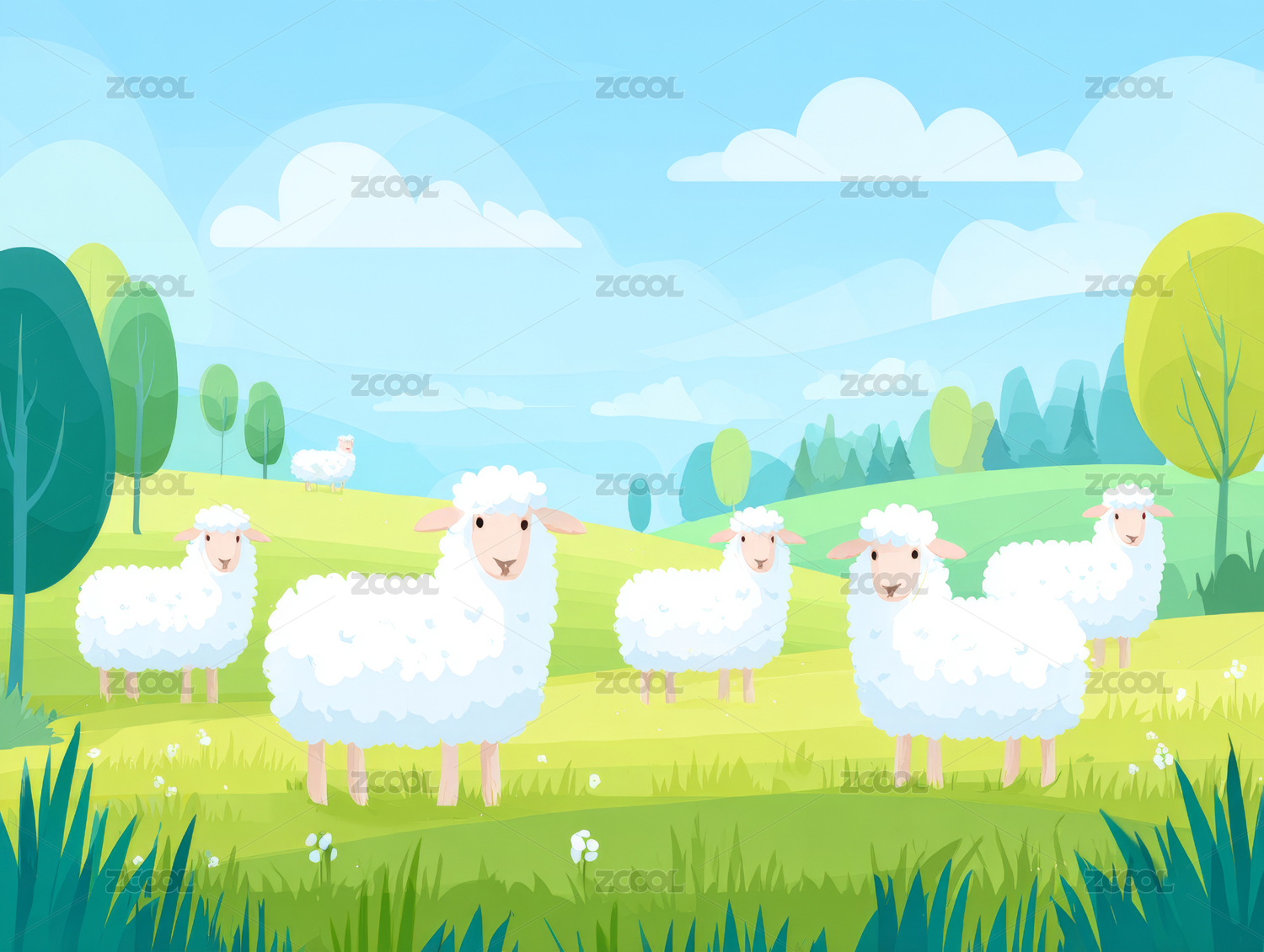 羊,绿色,牧场,阳光,白云,风景,插画,卡通,可爱,乡村