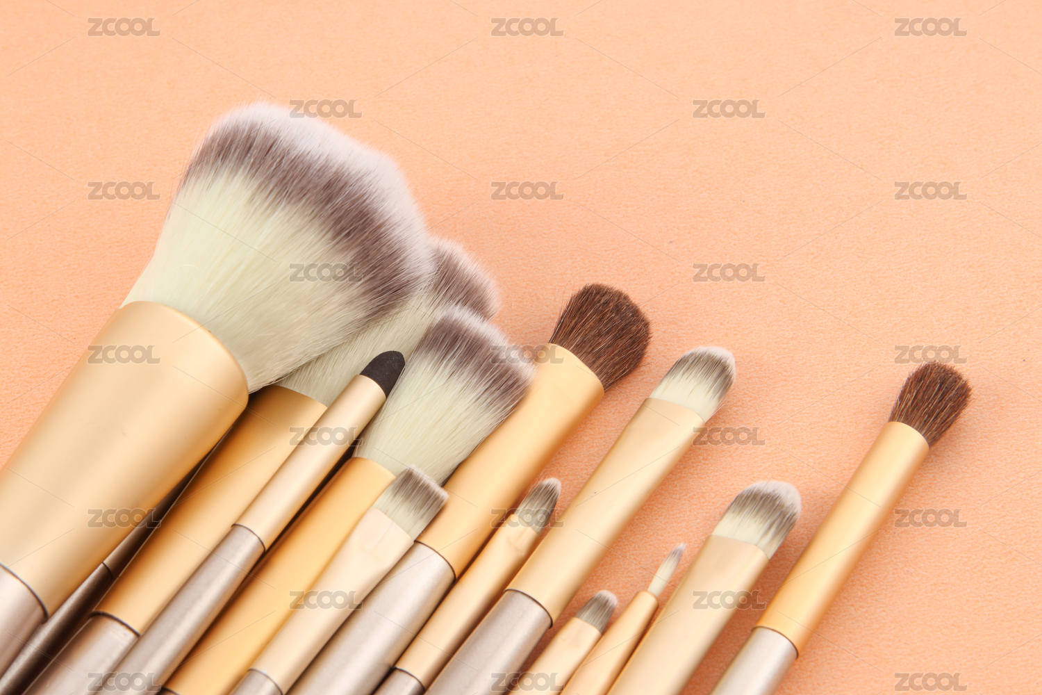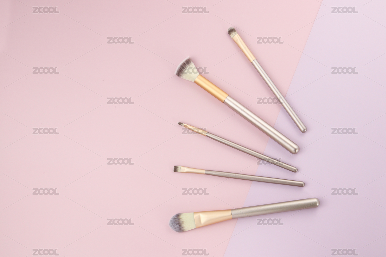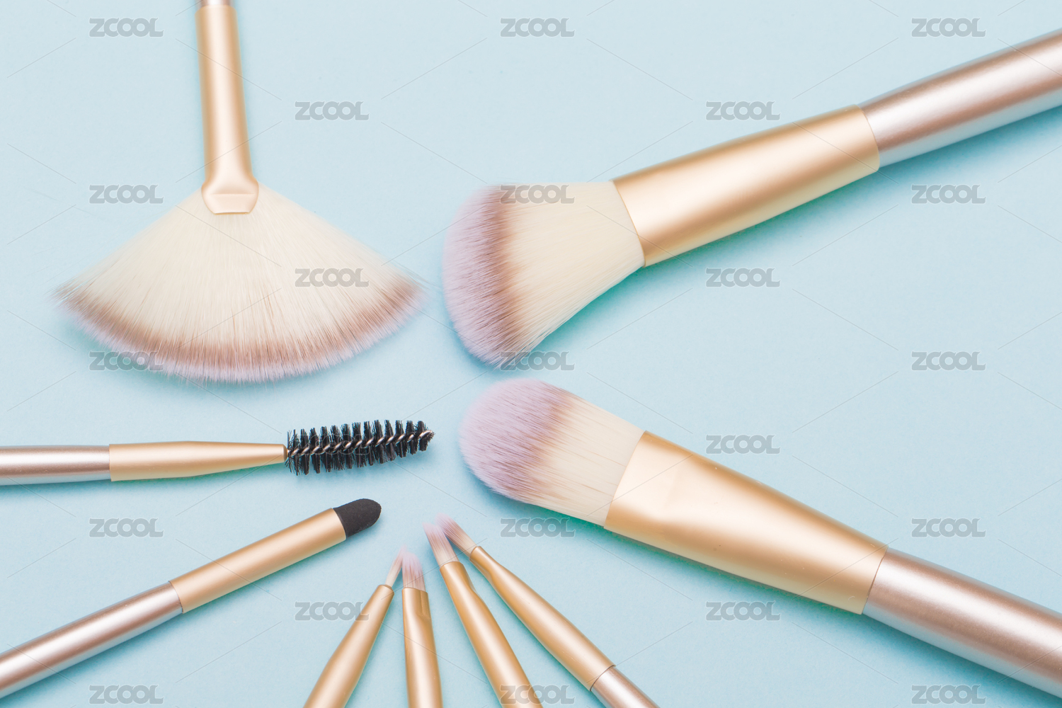 不同尺寸用途的化妆刷放在彩色的背景纸上。
