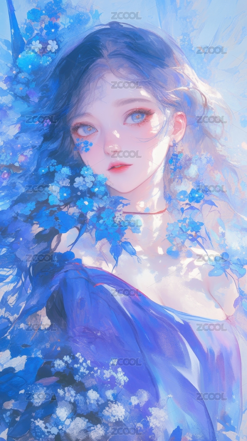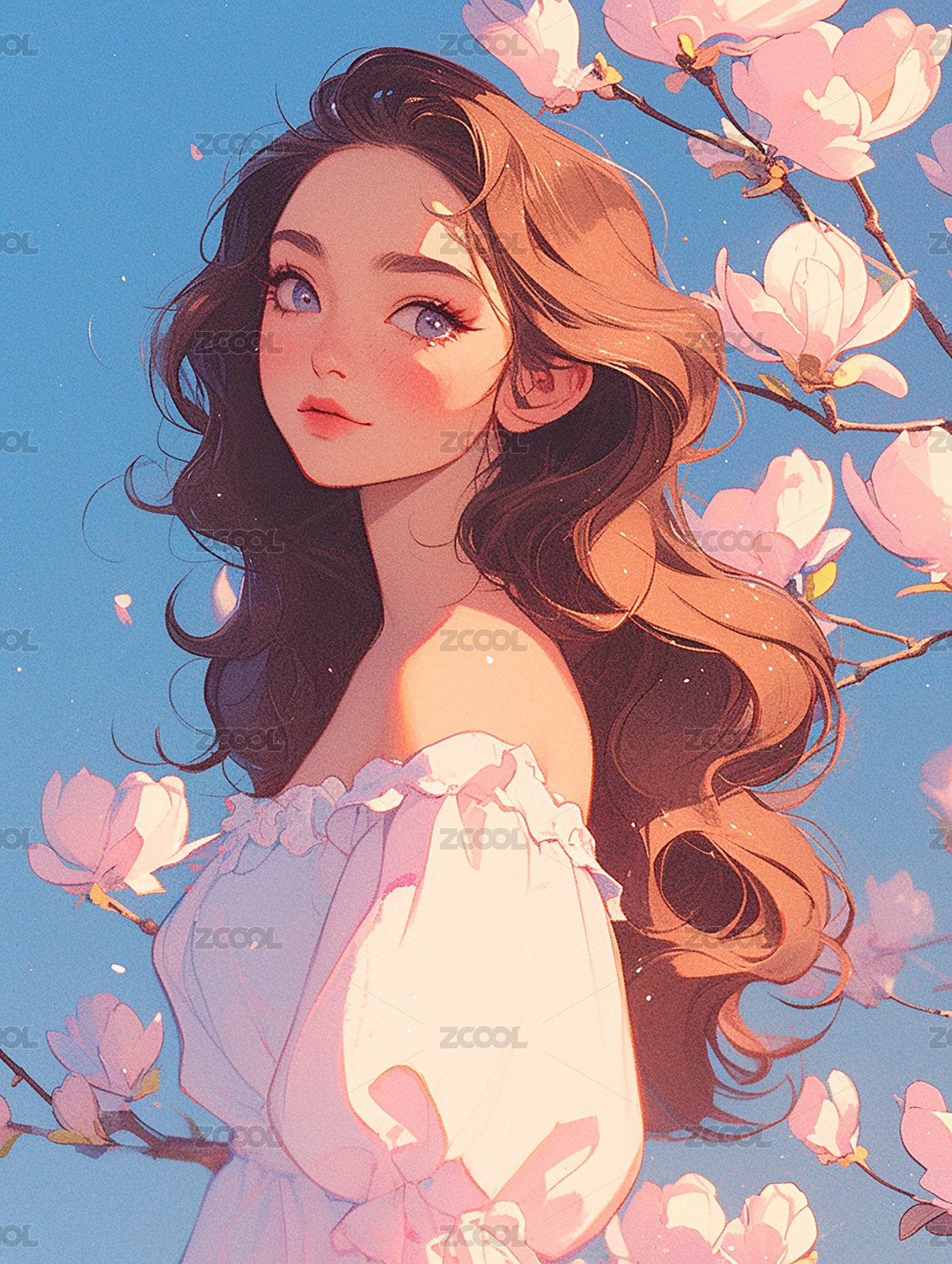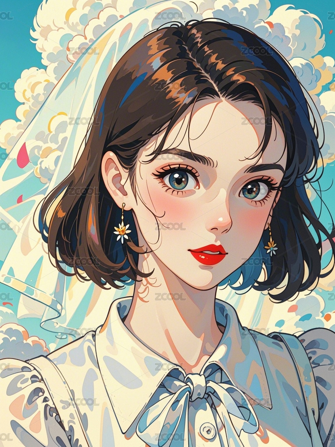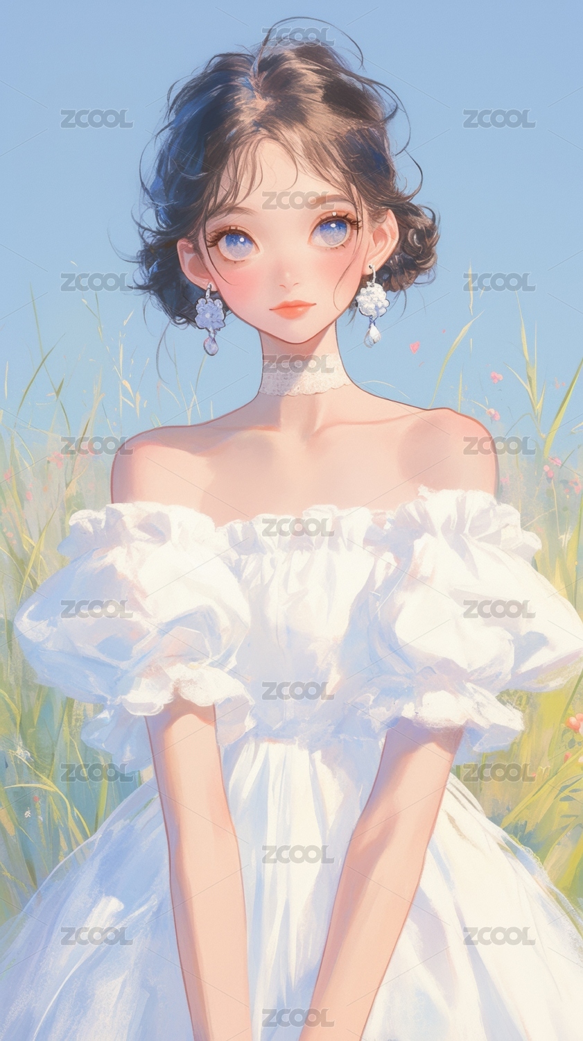 美女,珍珠,卷发,对视,竖构图,插画,礼服,女孩