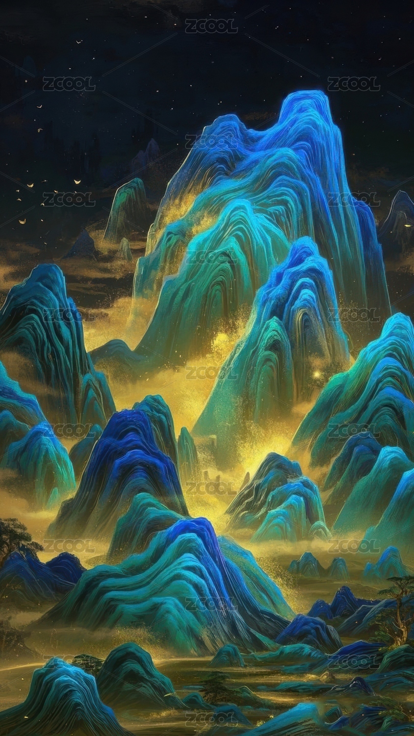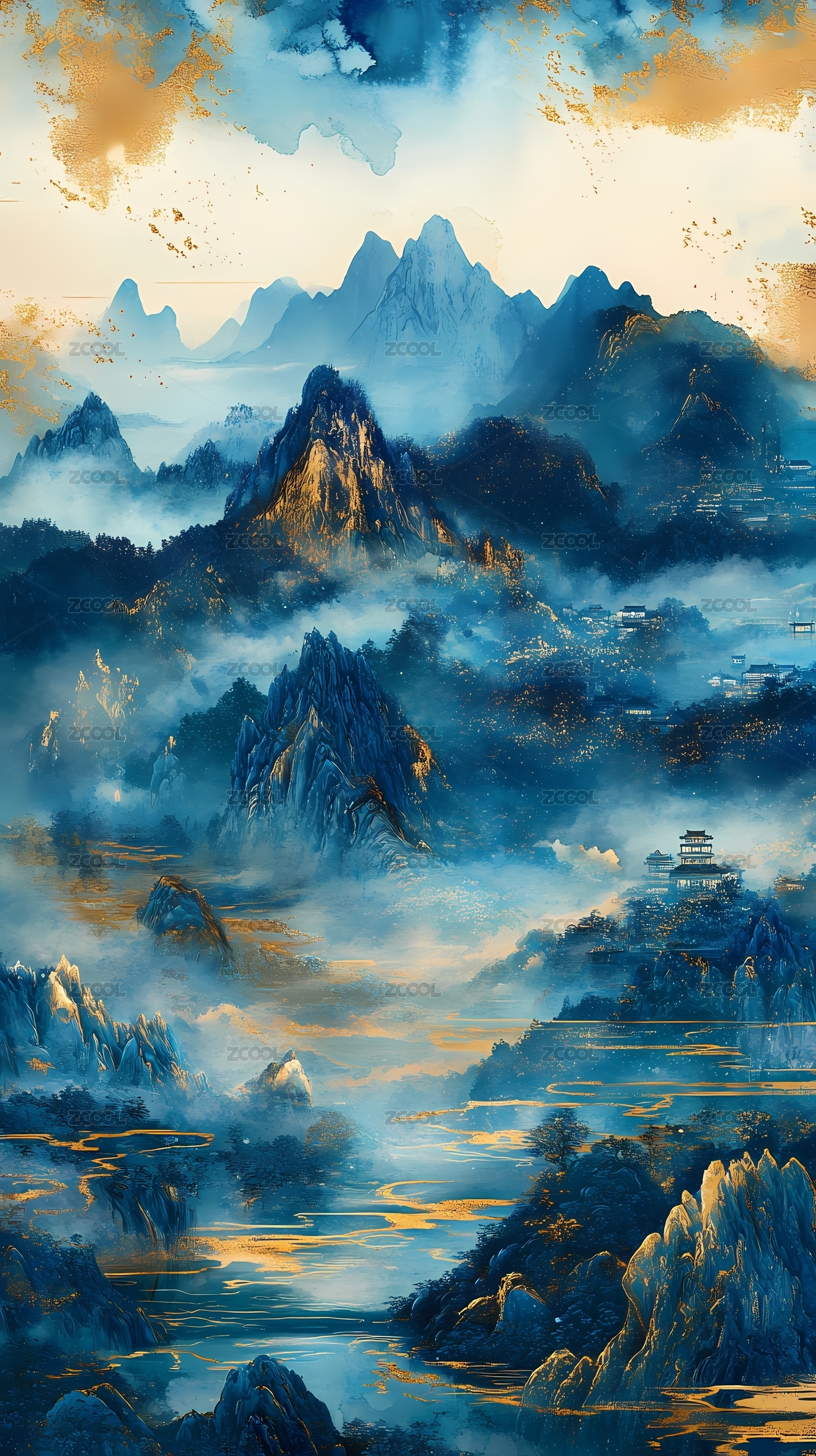 山水,河流,风景,群山,宁静,鎏金,烫金,金粉
