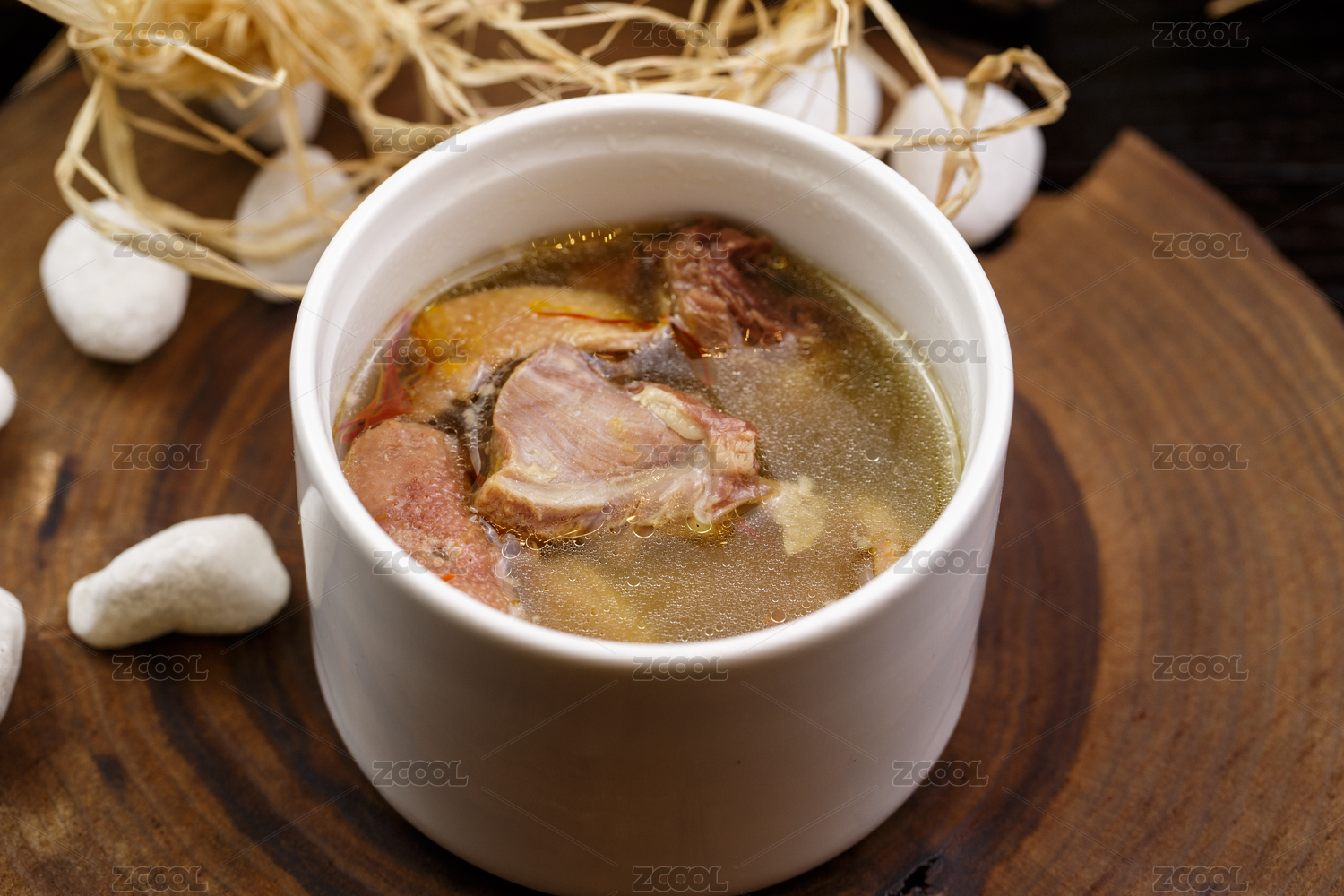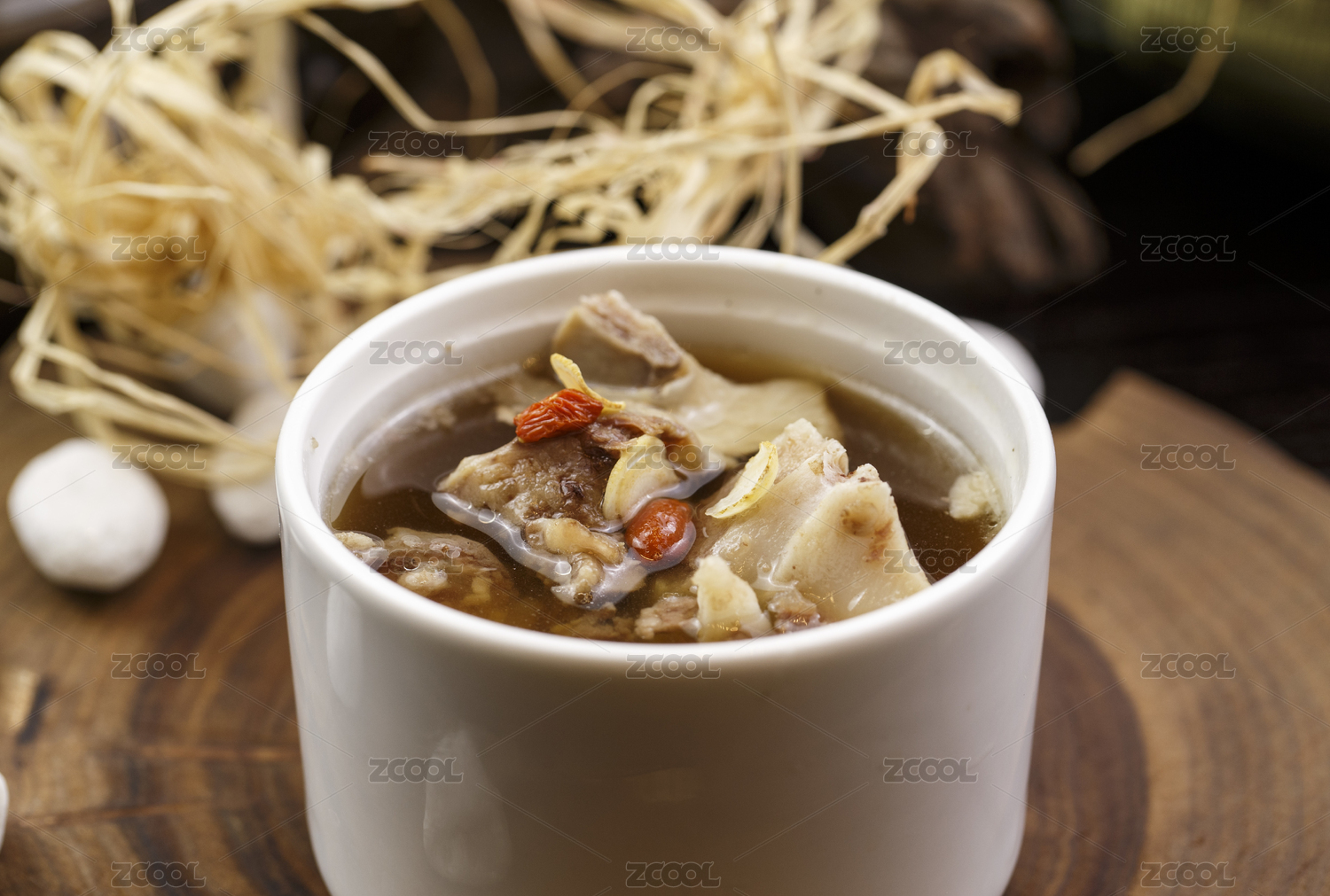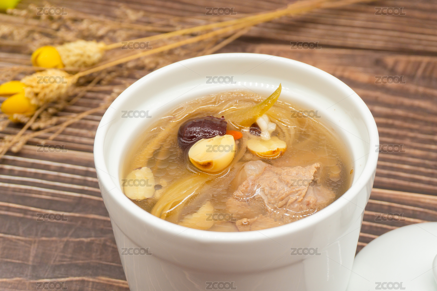 白色瓷汤罐装的虫草花老鸭汤摆放在砧板上