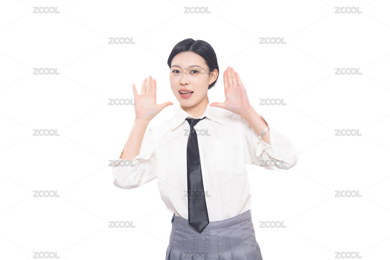 手指弯曲表情夸张搞怪可爱的亚裔女孩站在纯色背景墙前