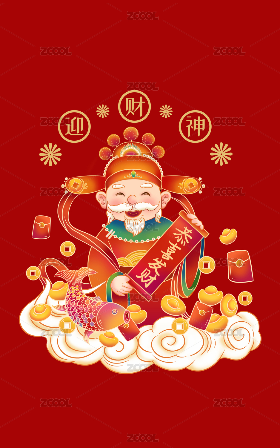 灯笼红包元宝鲤鱼财迎神手绘插画