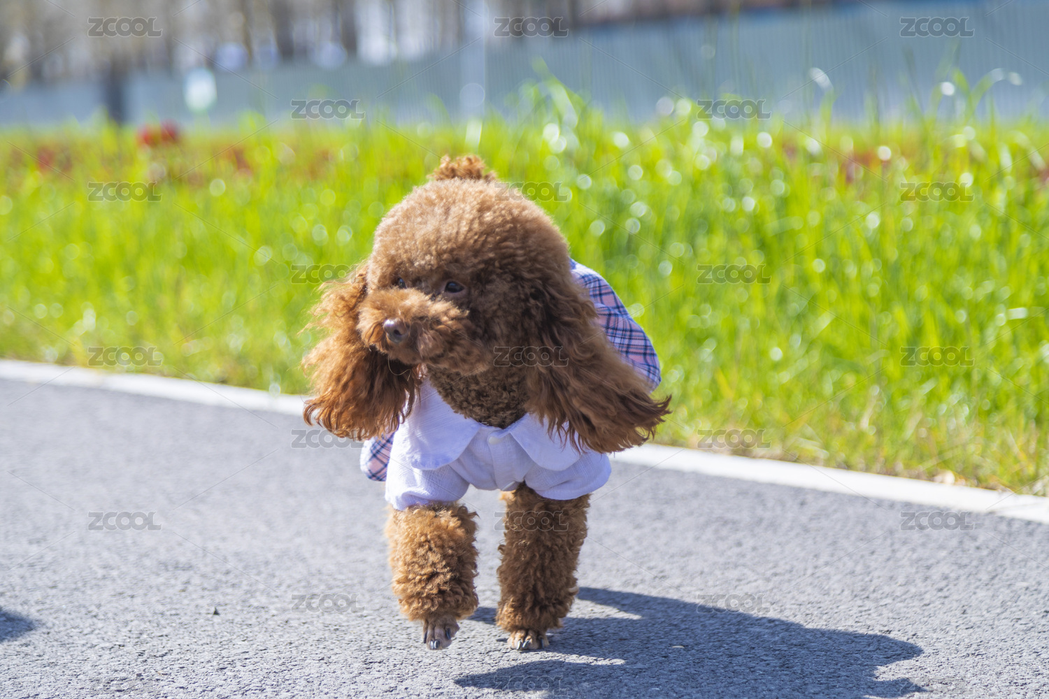 在杂草丛生的公园里,一只穿着衣服的棕色小泰迪犬走在石头铺的路上
