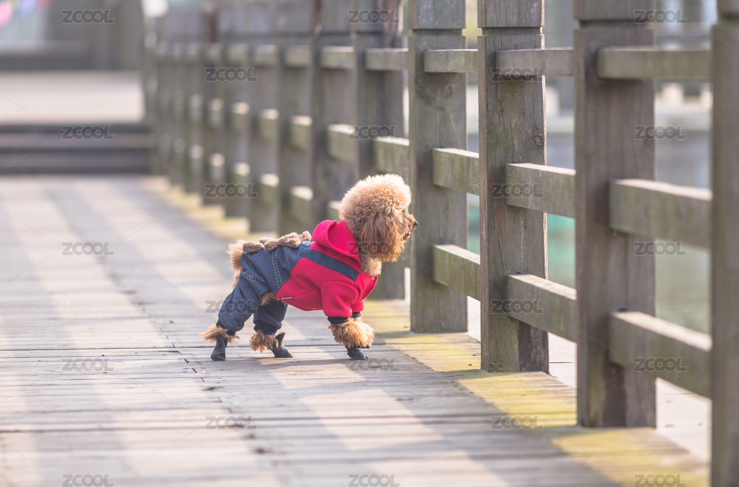 在公园里,一只穿着白色一幅的棕色小泰迪犬走在实木椅子上