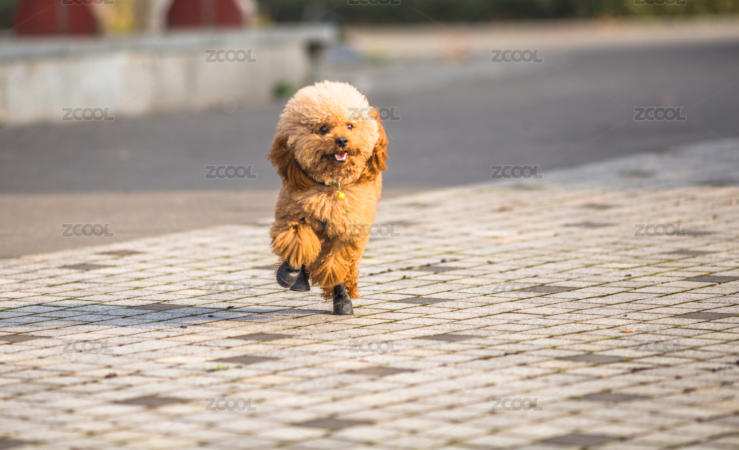 在绿树环绕的公园里,一只穿着衣服的棕色小泰迪犬走在石头铺的路上