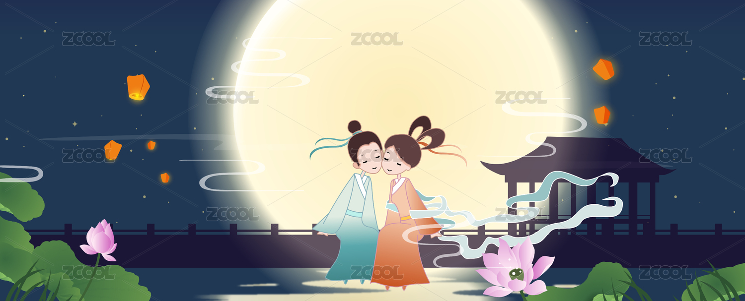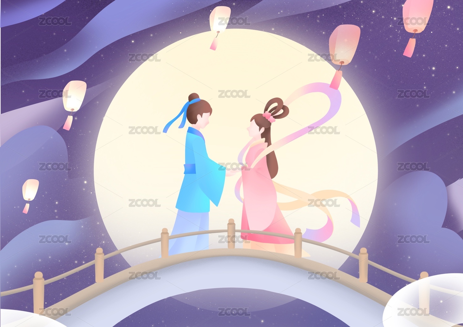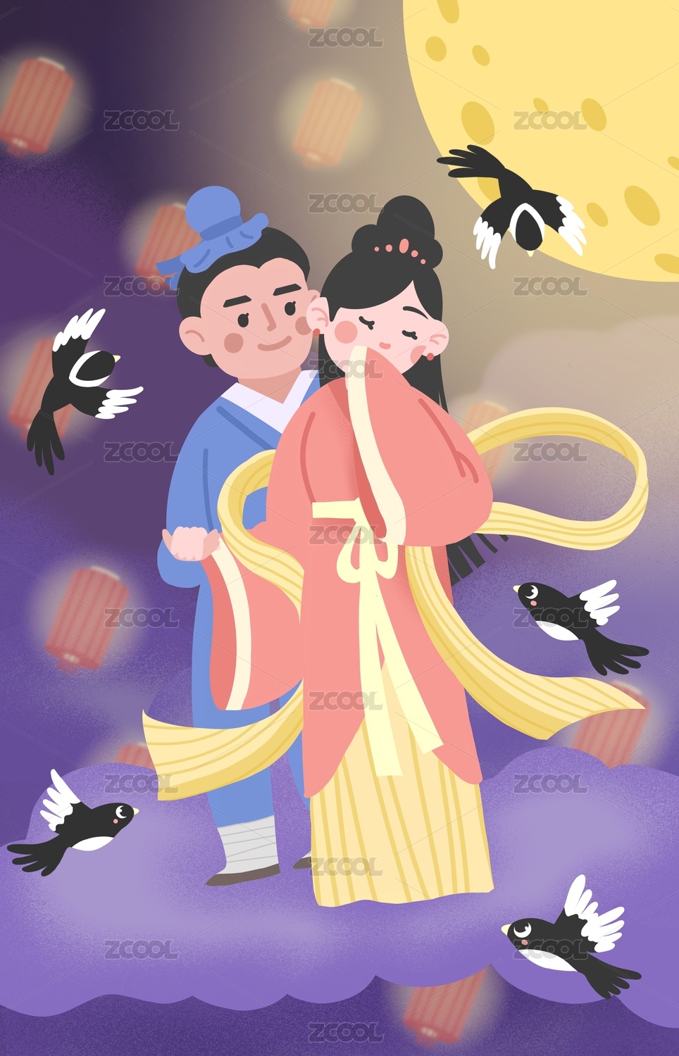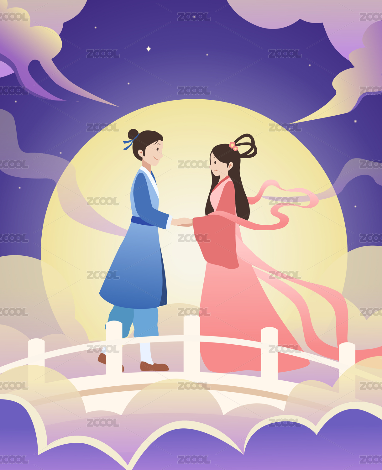 七夕,情人节,情侣,织女,桥,灯笼,夜晚,山,云,牵手
