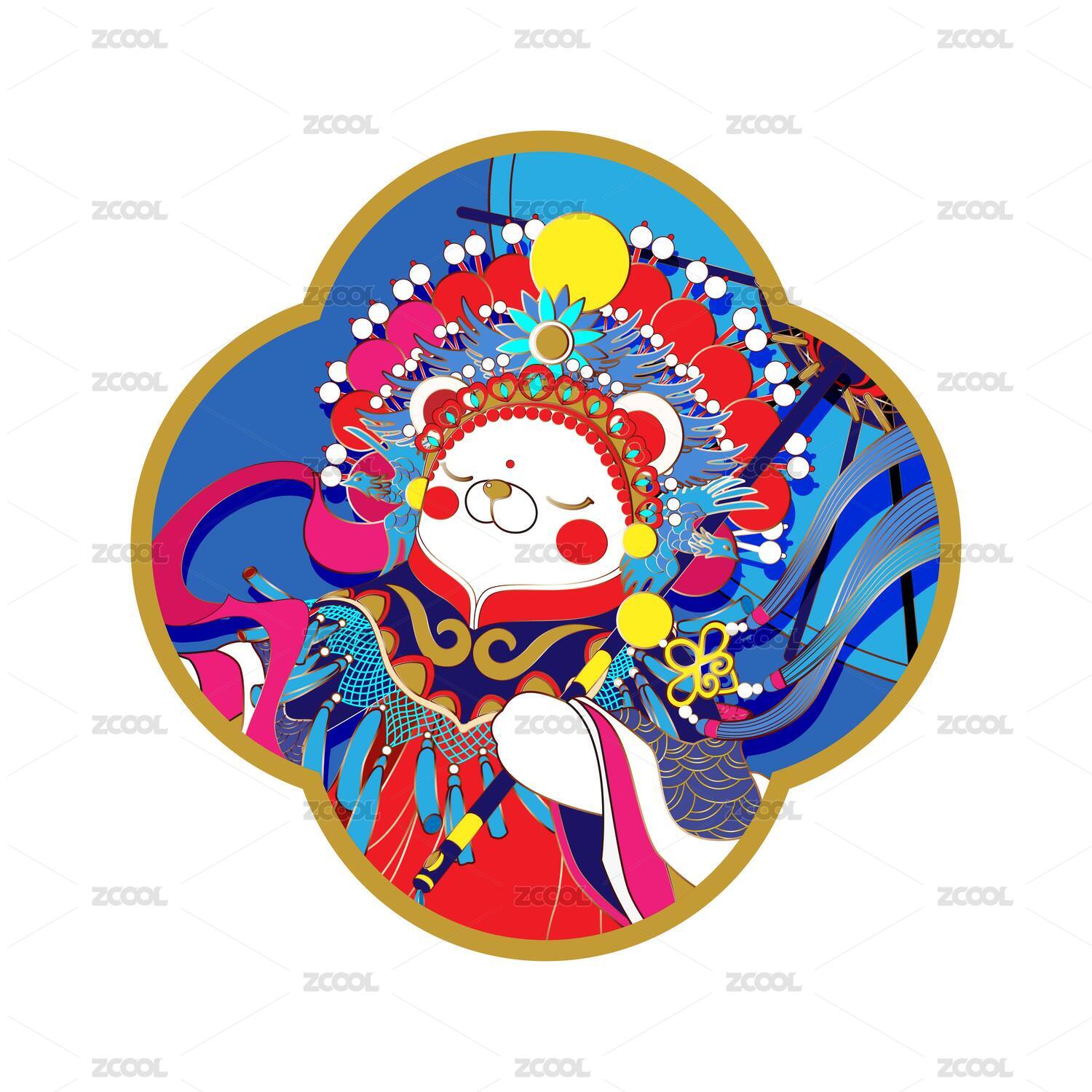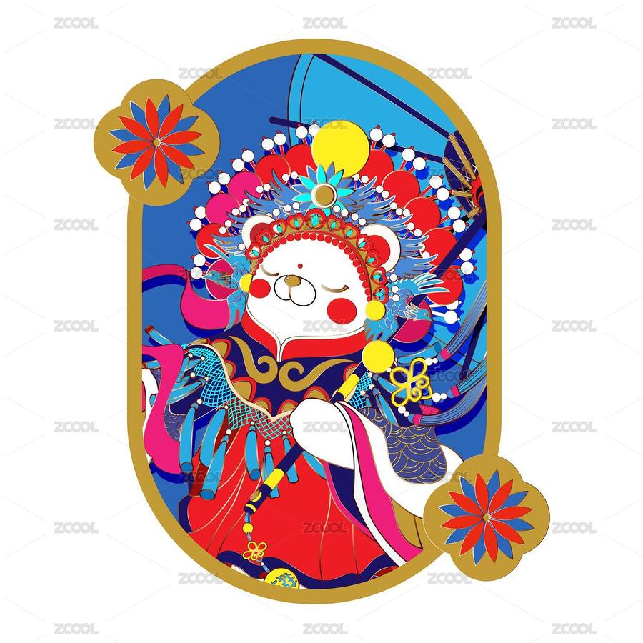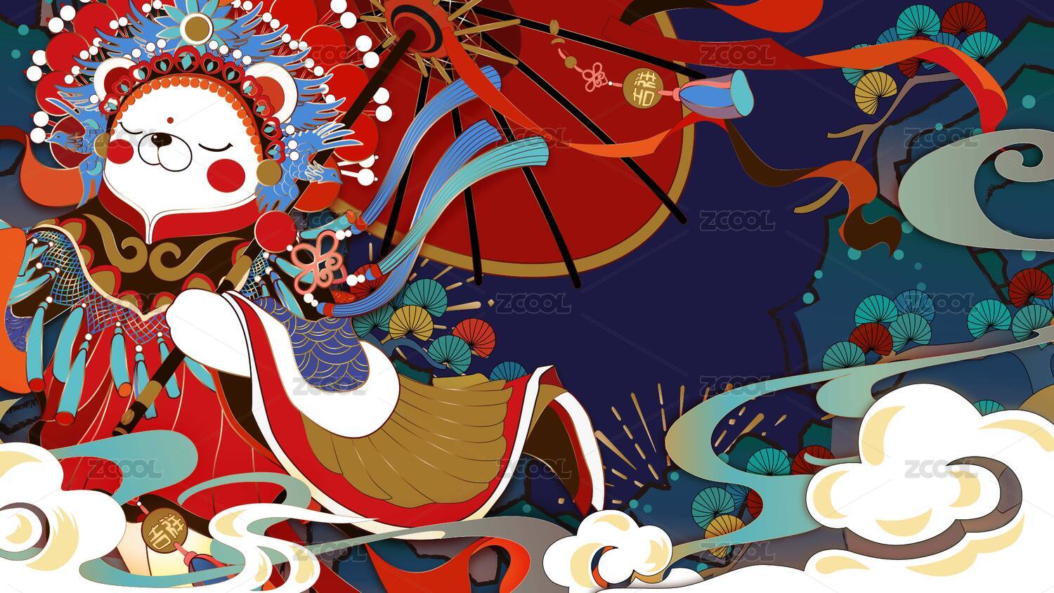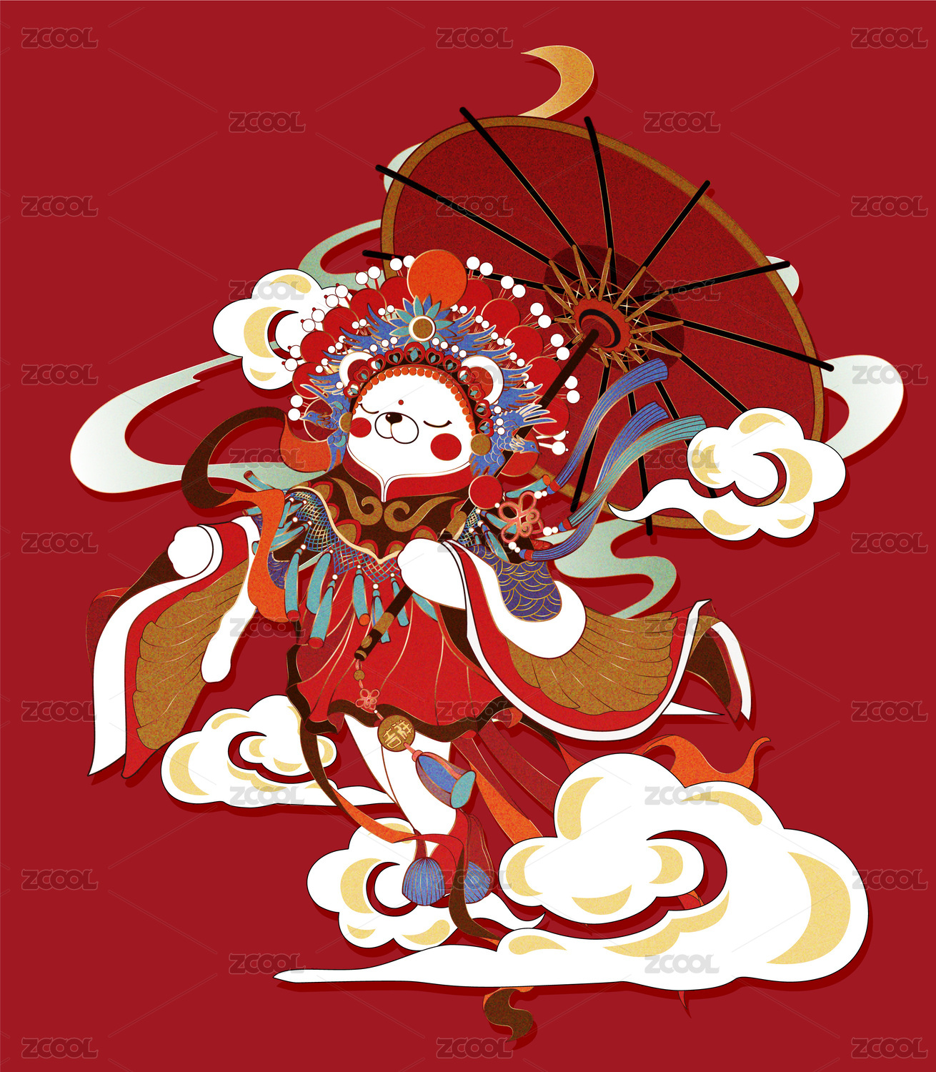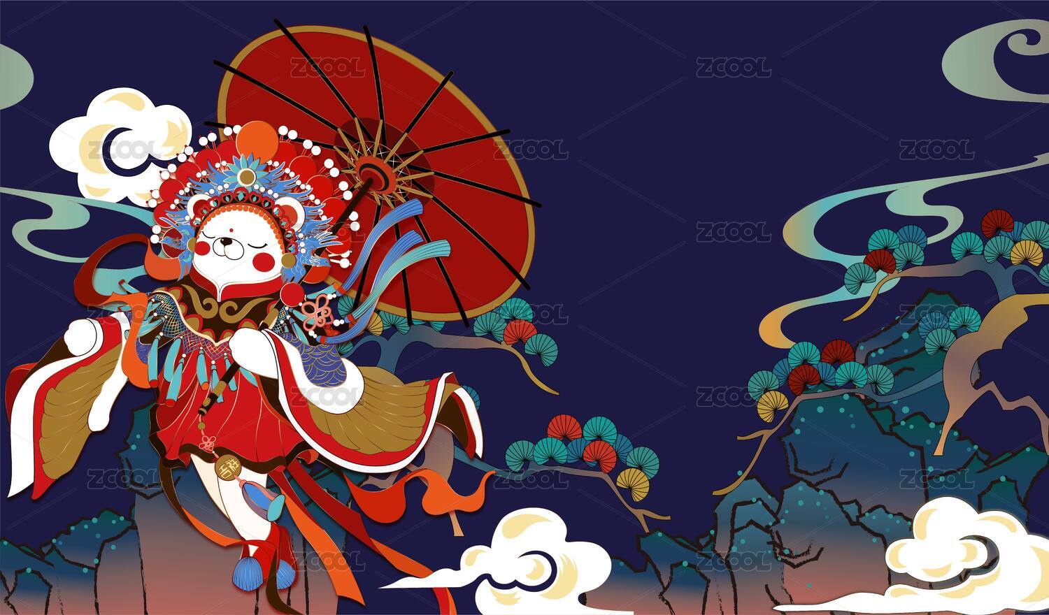 国潮戏曲京剧脚踏祥云的吉祥熊矢量插画