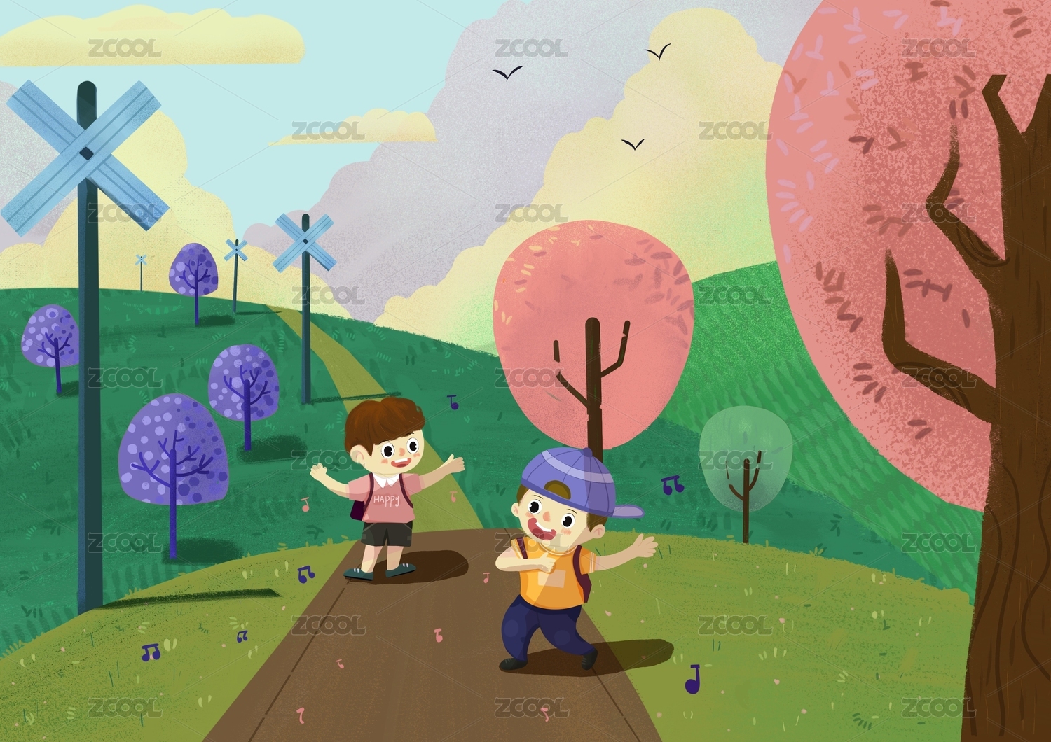户外大自然树下男孩坐草地上乘凉玩耍插画