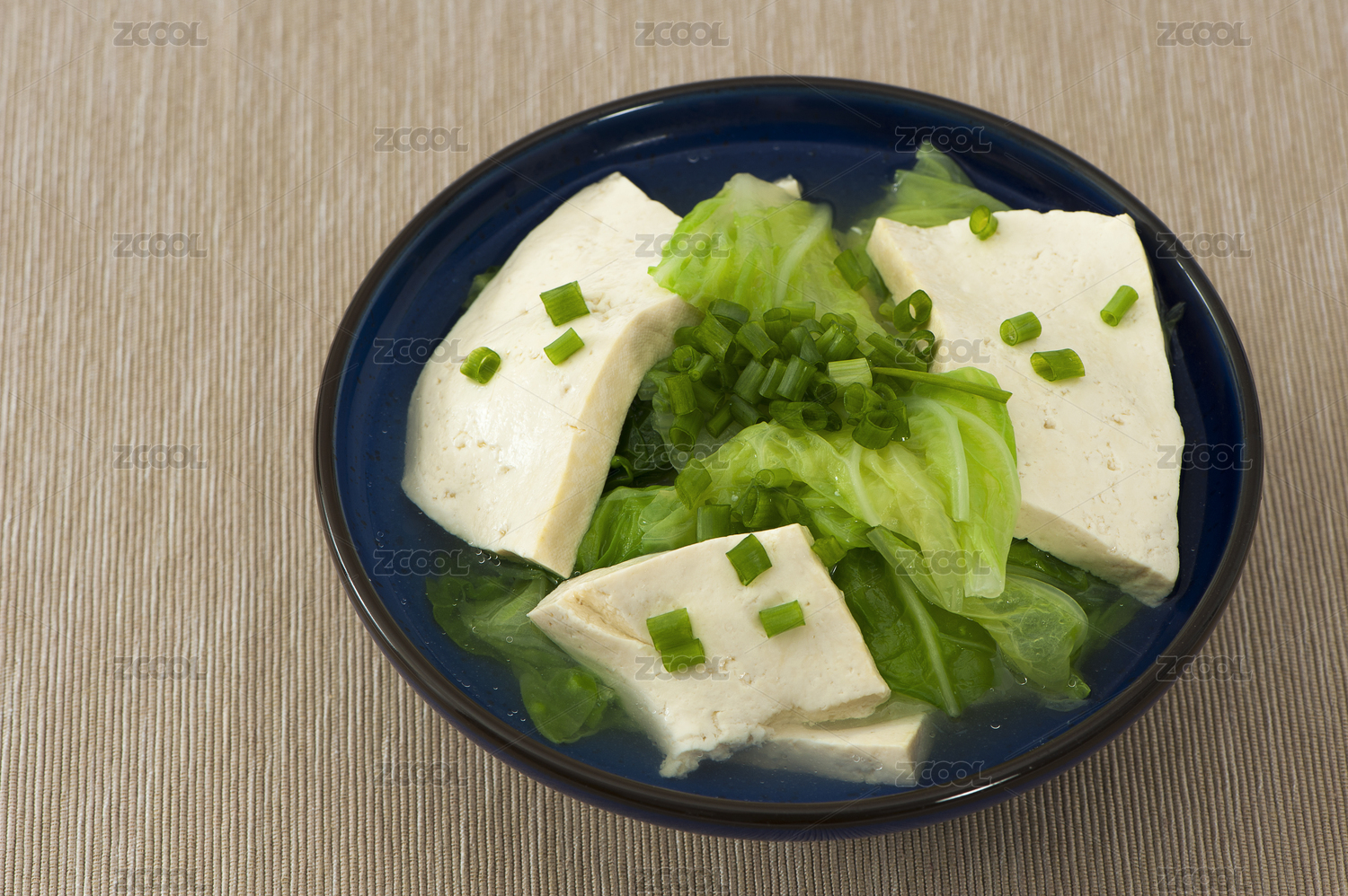 桌面上的盘子里的美味可口的小葱拌豆腐
