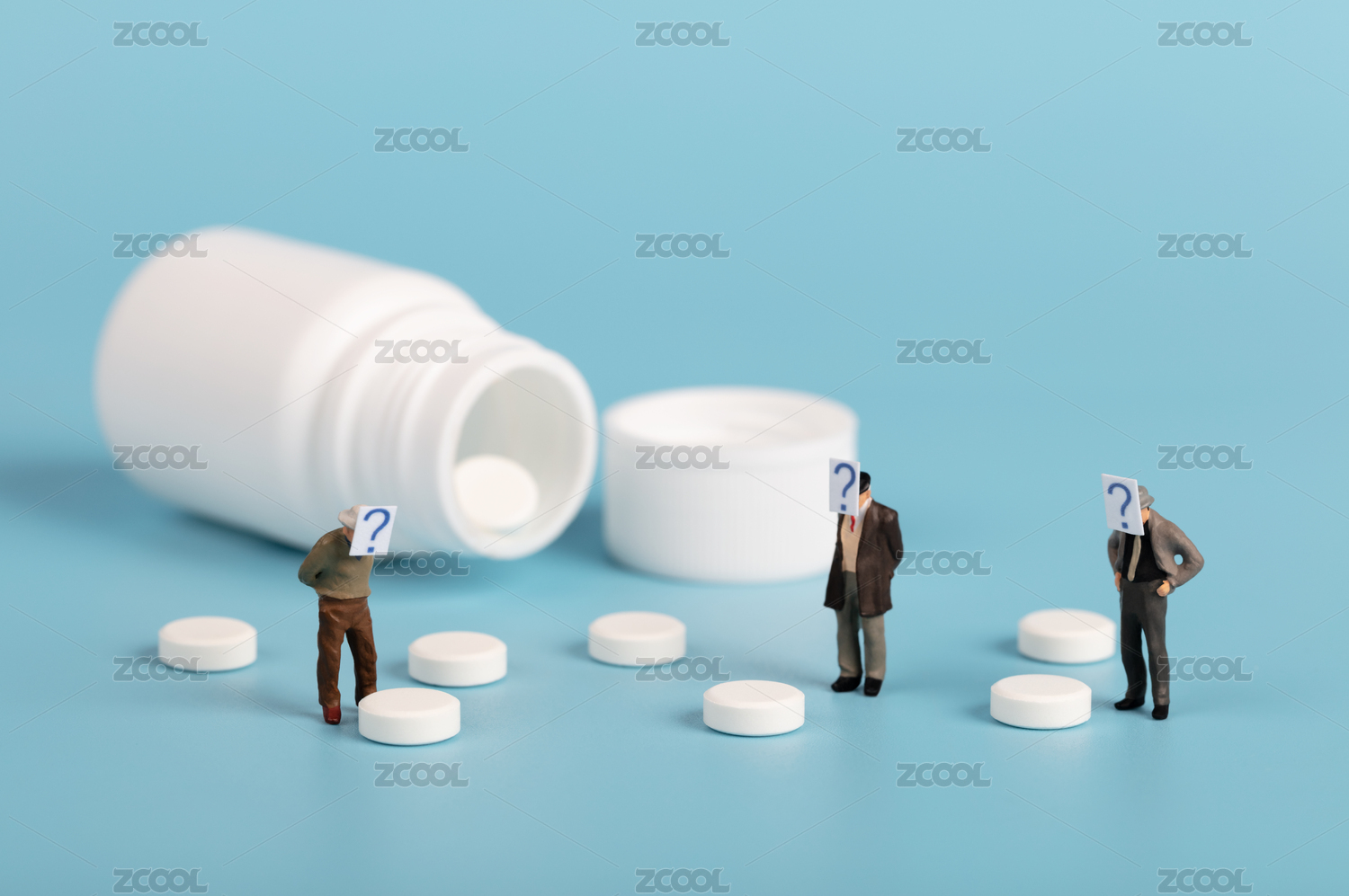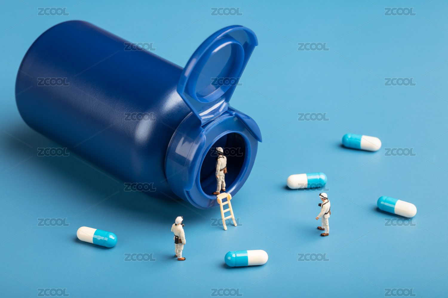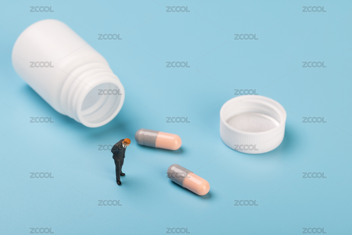 创意微缩蓝色背景站在药品胶囊旁边思考的人