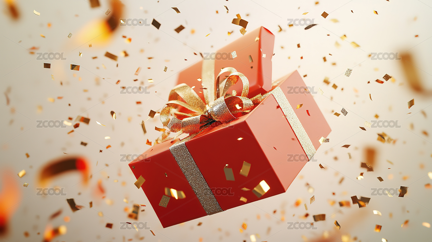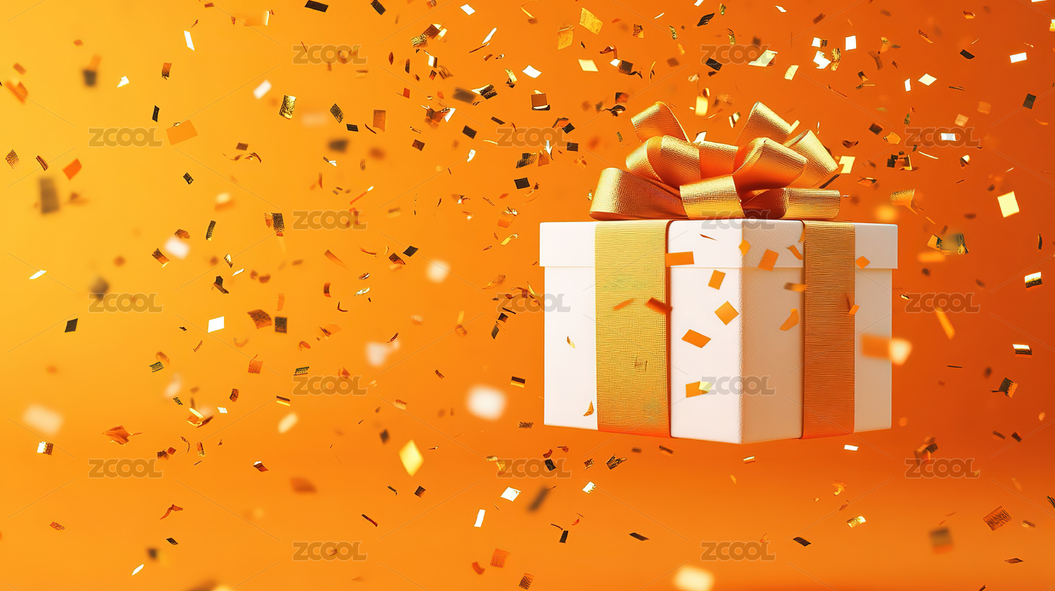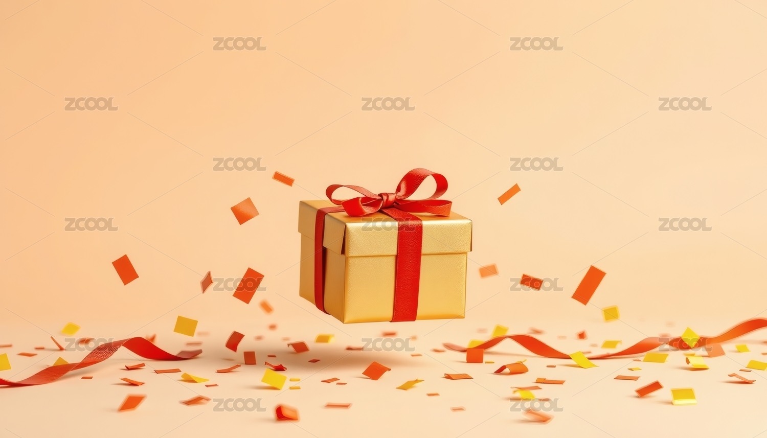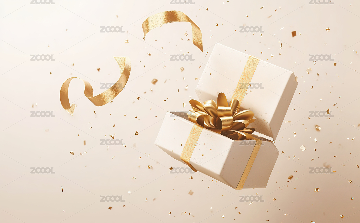 飘飞彩带旁的金色礼品盒