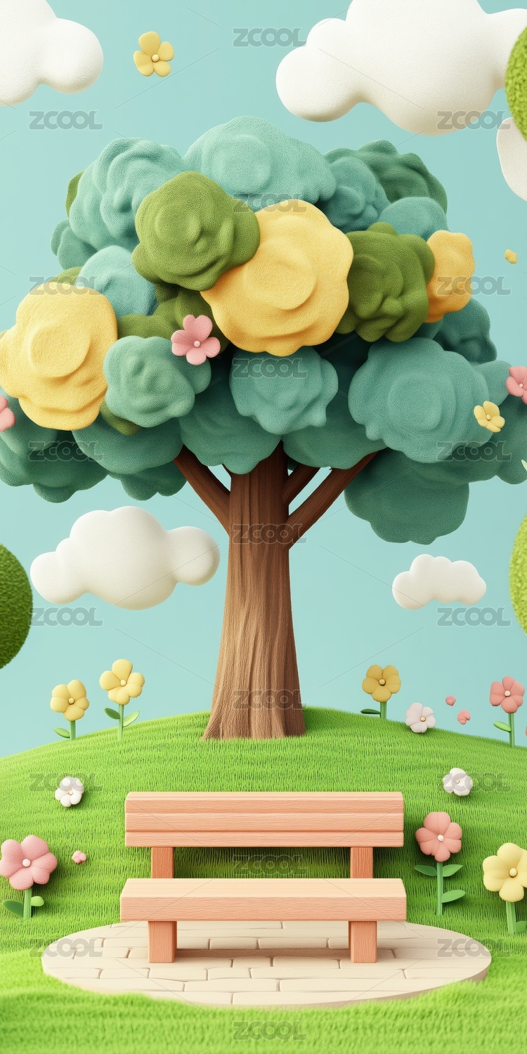 春天公园大树下羊毛毡休闲长椅3D卡通插画