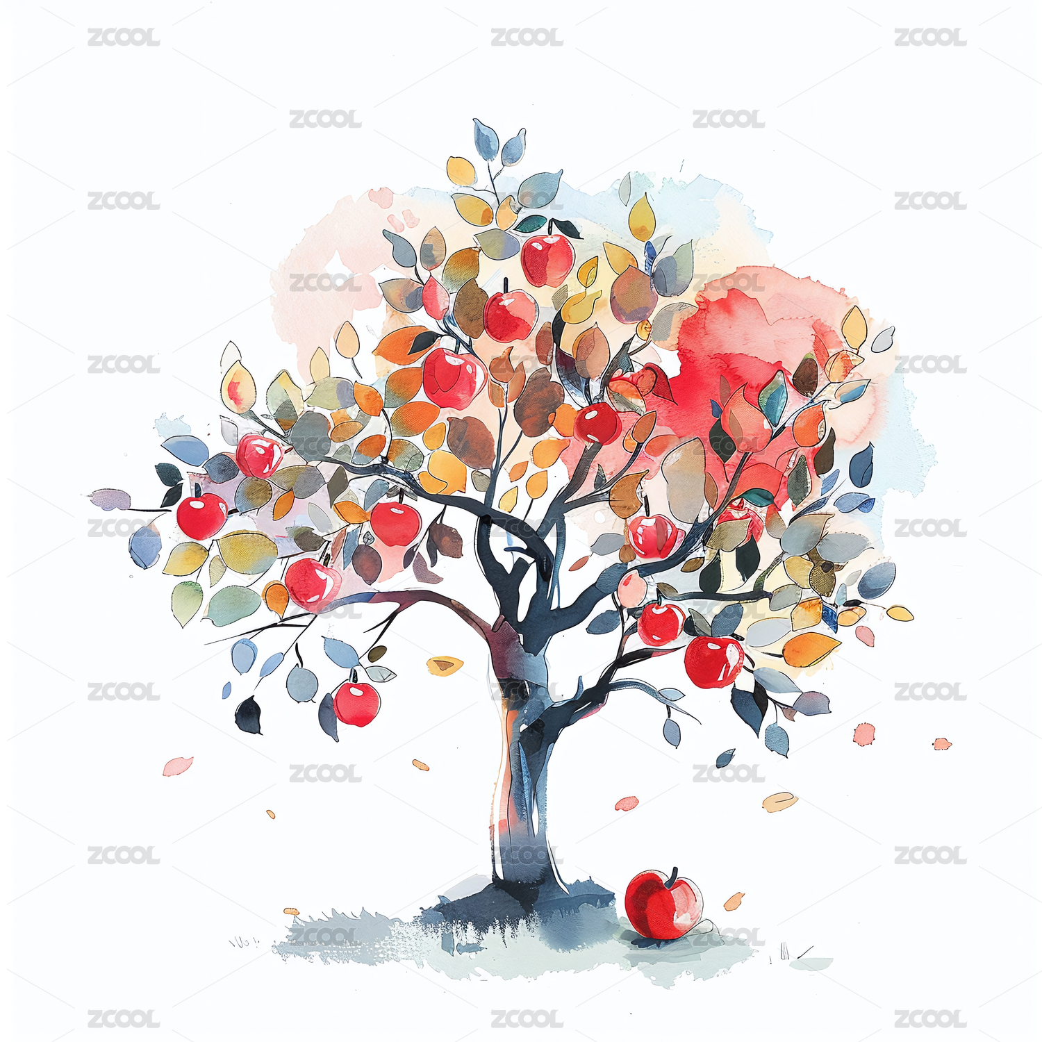 水彩风格丰收的苹果树