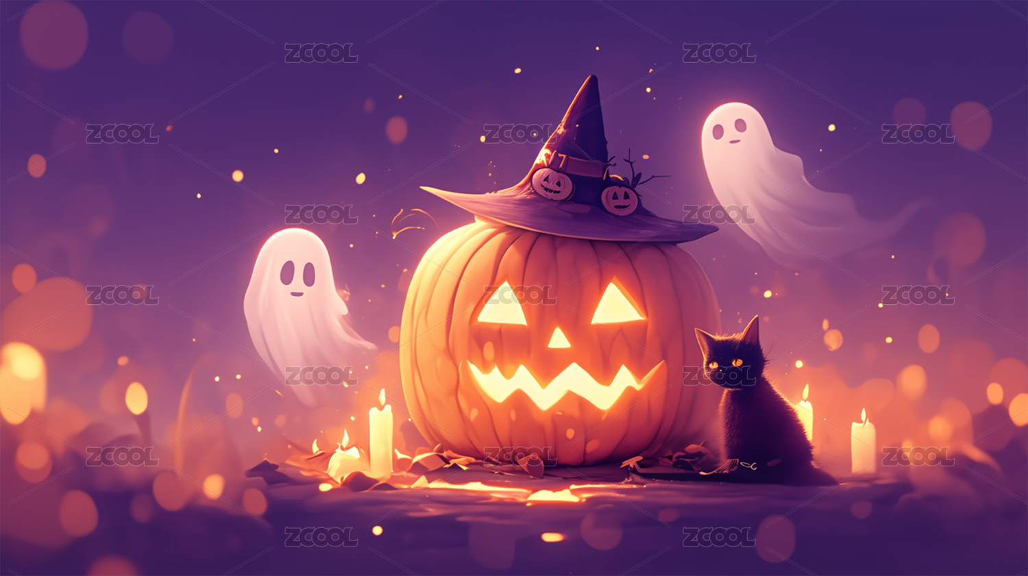 万圣节,南瓜,魔法帽,黑猫,小幽灵,紫色,蜡烛,鬼怪,南瓜灯
