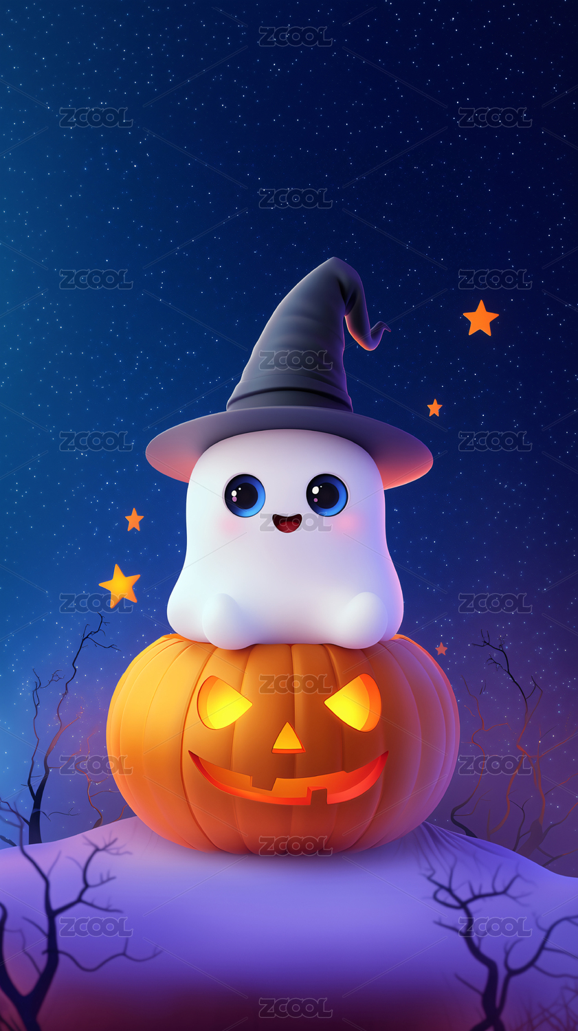 可爱幽灵巫帽抱南瓜庆祝万圣节
