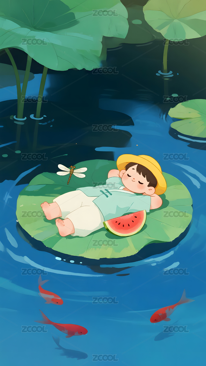 立夏节气人物池塘吃西瓜插画夏天解暑海报