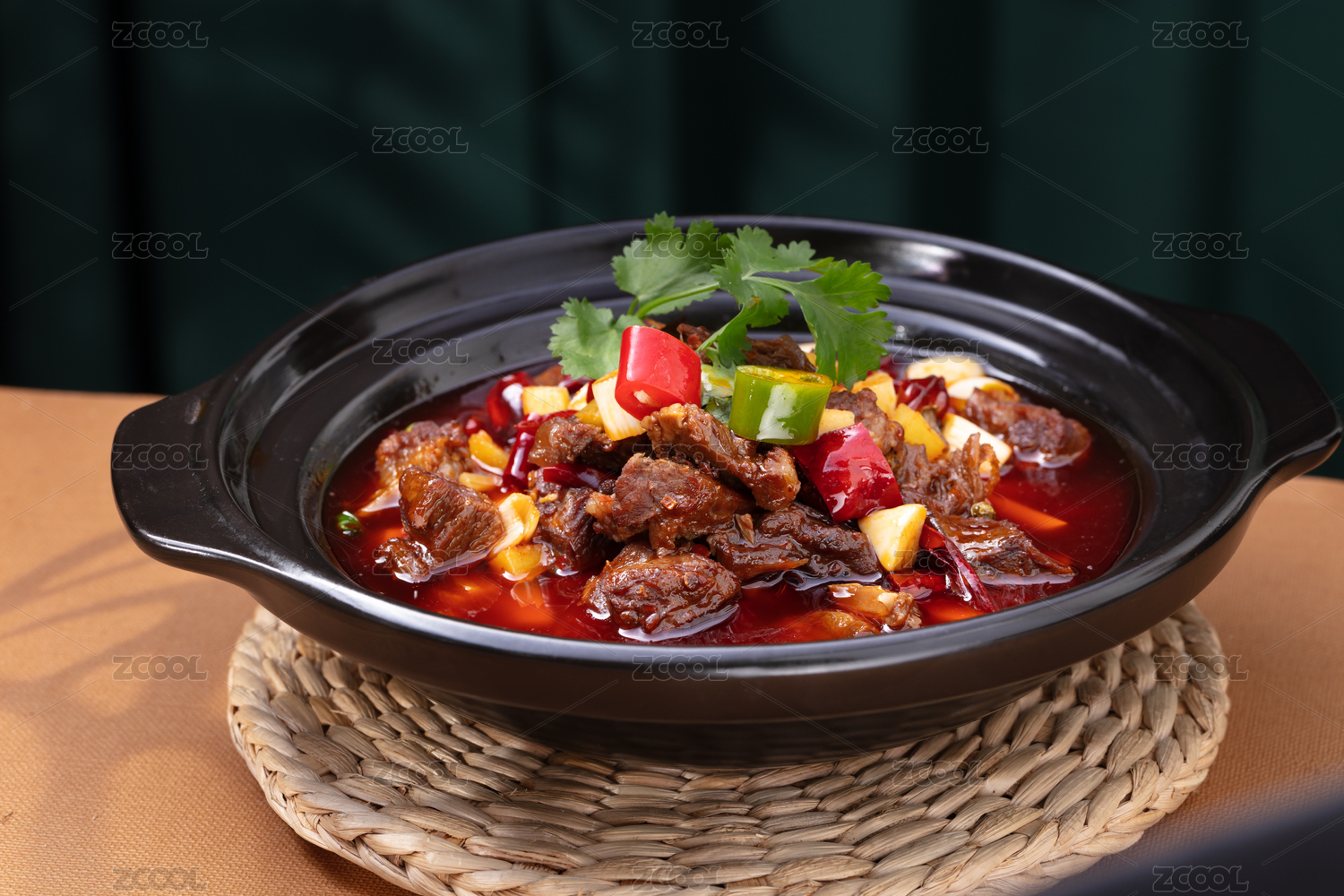 草垫上黑色砂锅里的红烧牛腩红烧牛肉