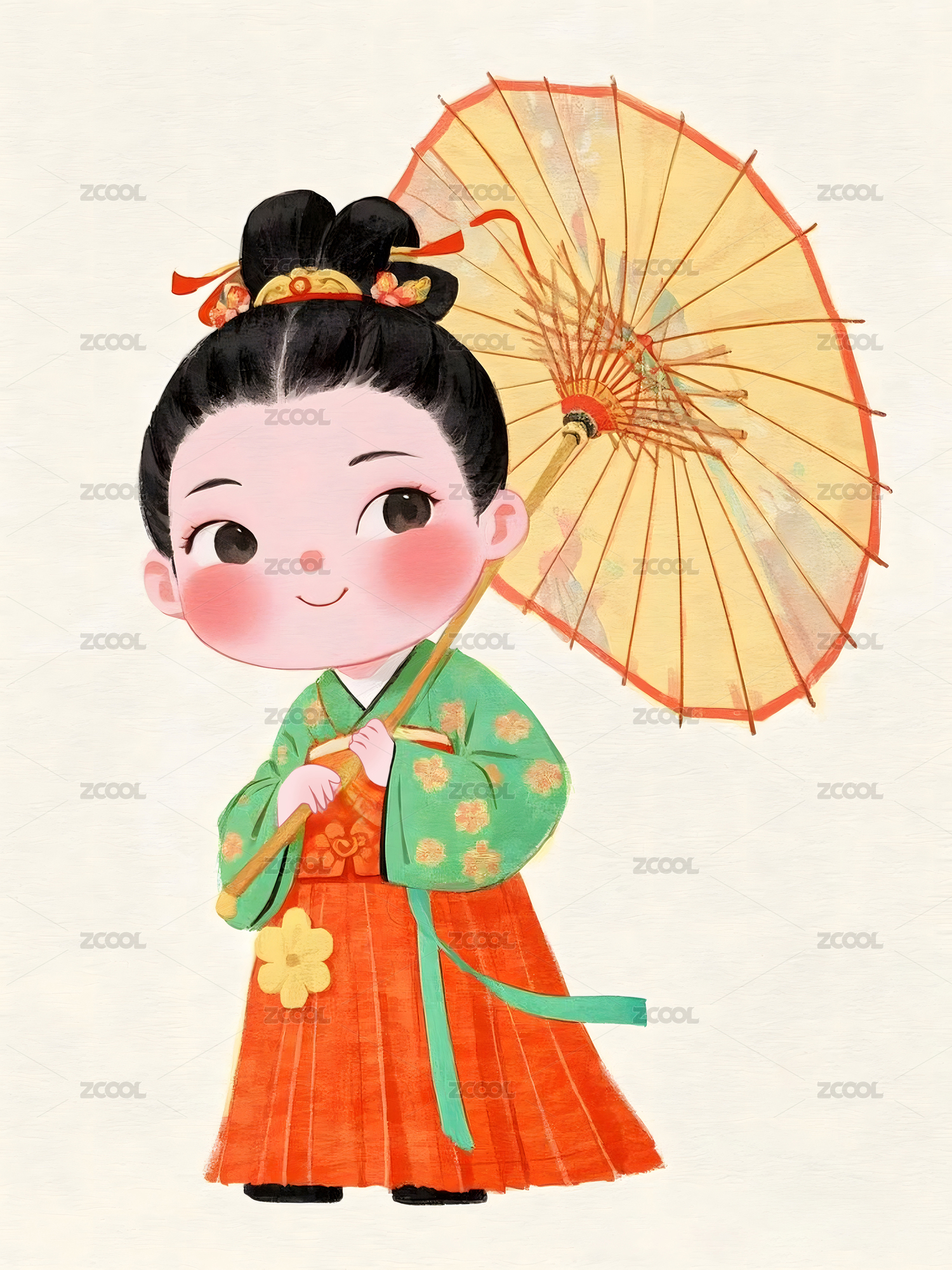Q版可爱古代穿着汉服的唐女孩原创手绘插画