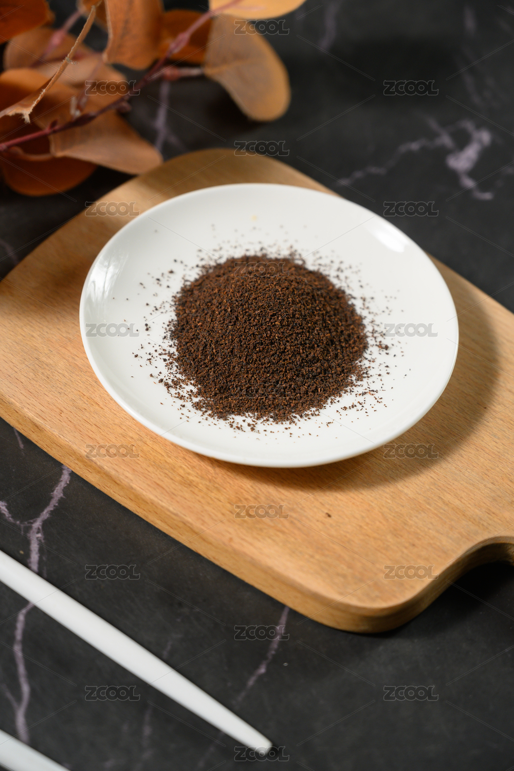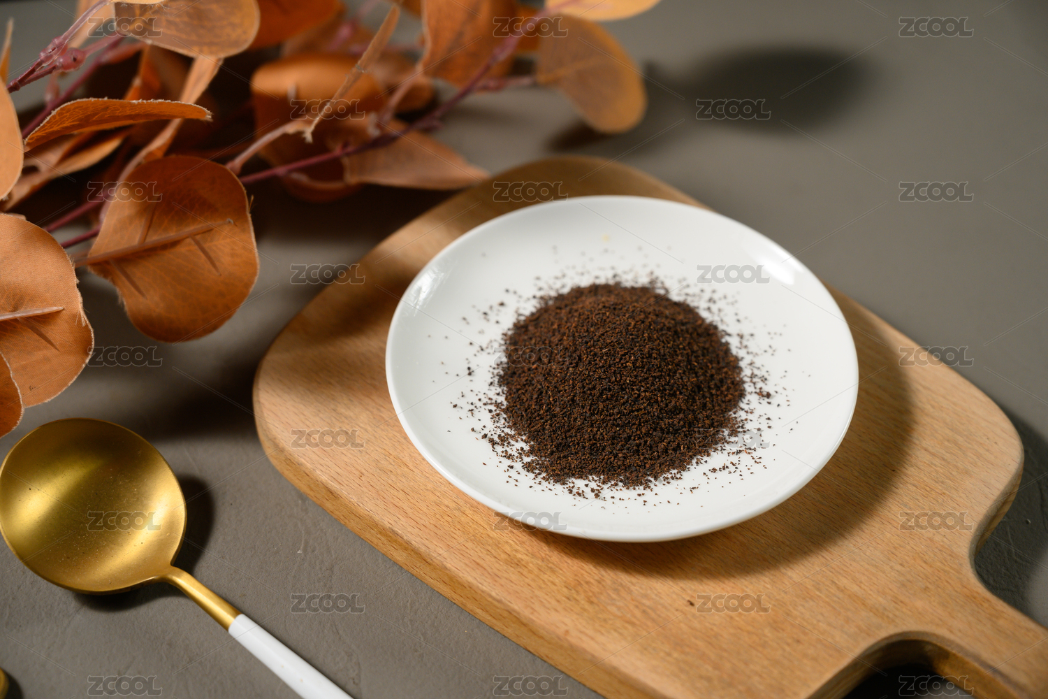 桌面上的盘子里的香气四溢的锡兰红茶茶叶粉