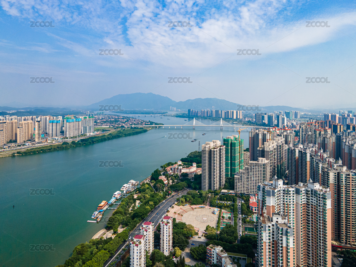 中国广东省清远市北江两岸建筑桥梁航拍景观