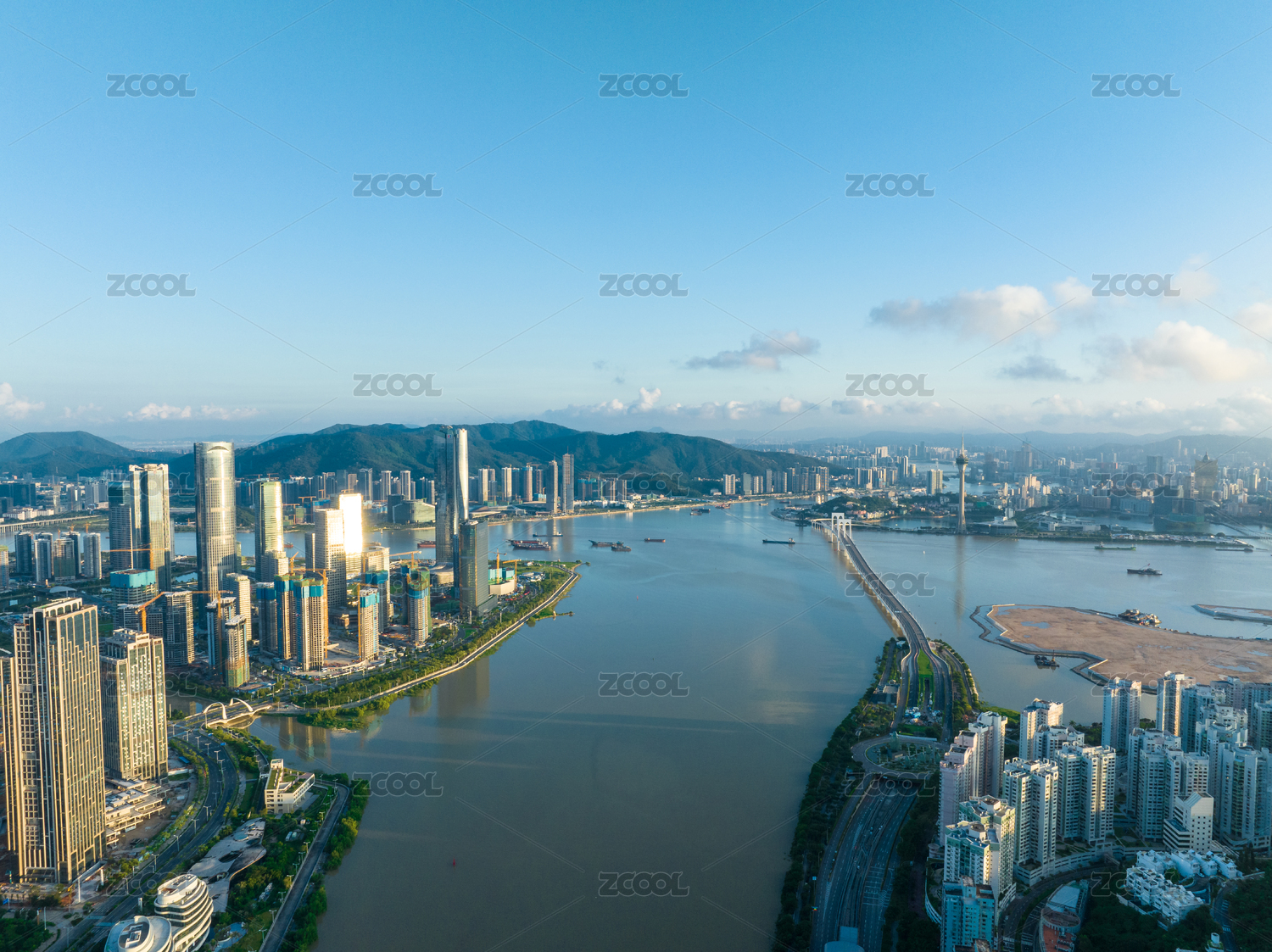 中国广东省珠海湾区与珠澳跨境工业区航拍