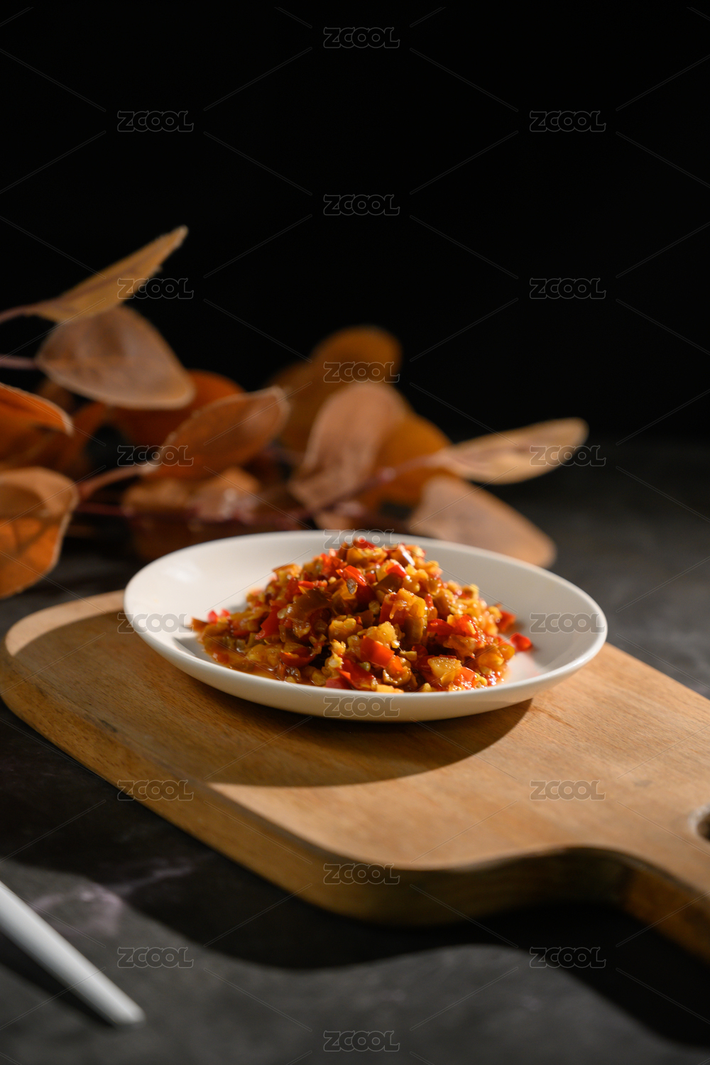 桌面上的盘子里的美味可口的青红剁椒